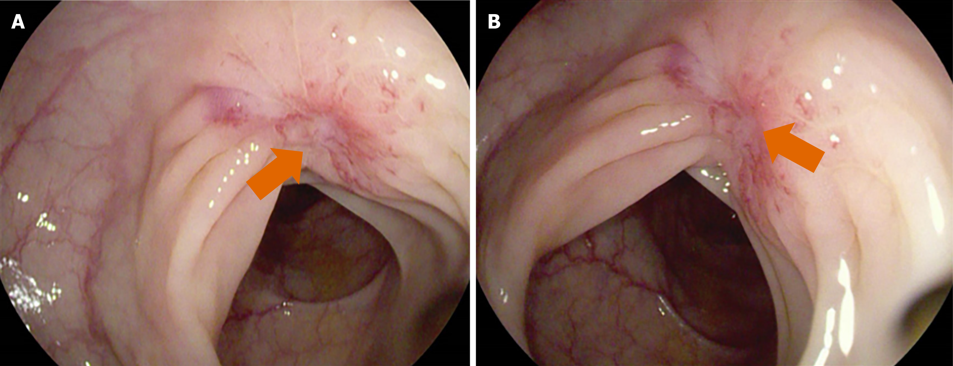 A and B: An infiltrative lesion was observed in the sigmoid colon approximately 35 cm from the anus, with surrounding mucosa converging toward the center and exhibiting fragile texture (orange arrow).