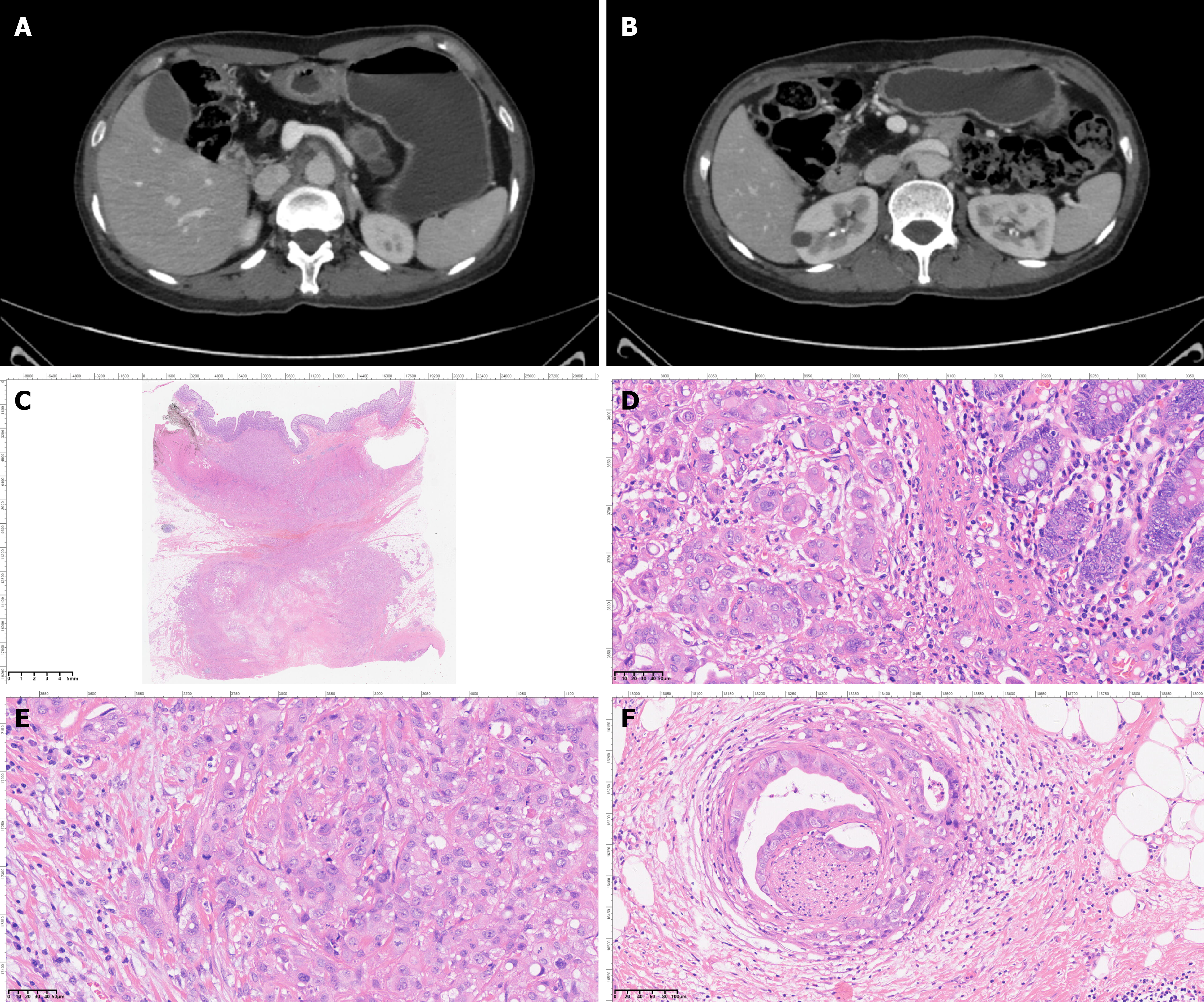 A and B: Pancreatic parenchymal atrophy, multiple calcifications in the pancreatic head and body, and a non-enhancing hypodense lesion in the pancreatic tail are observed; C: Malignant tumor cells were observed in the pathological specimen of pancreatic body and tail resection combined with partial colectomy; D: Tumor cell infiltration was observed in the colon; E: A large amount of ductal adenocarcinoma was observed in the pancreas; F: Perineural invasion by carcinoma was observed in the surrounding stroma.