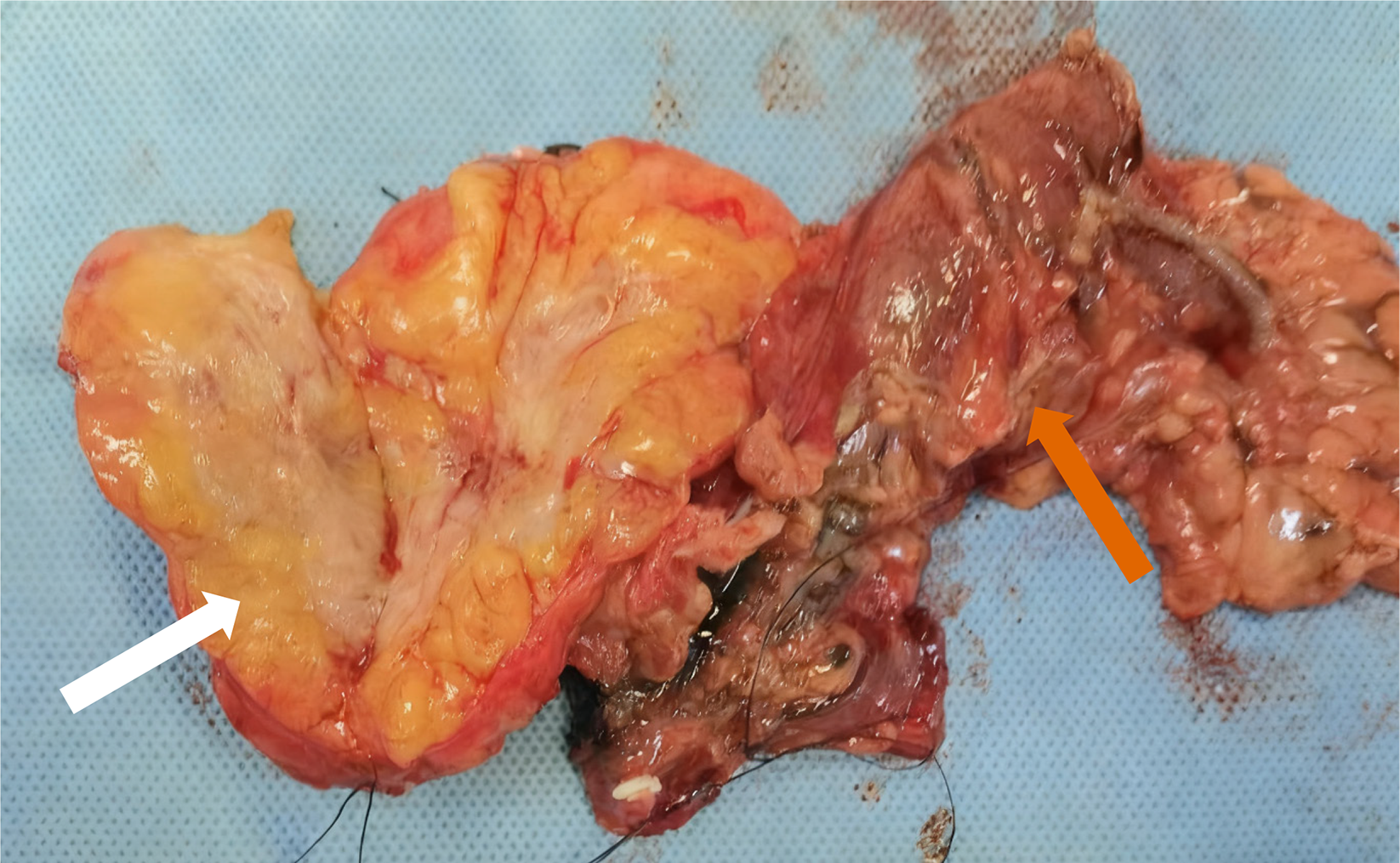 Pancreatic tumor (white arrow) and colon (orange arrow).