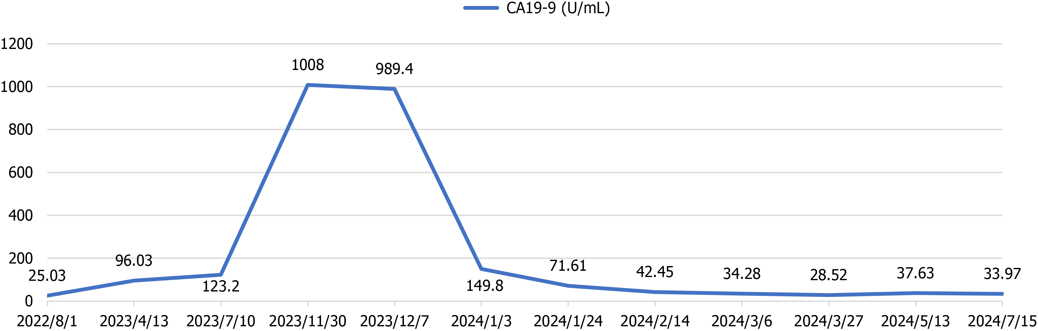 The preoperative carbohydrate antigen 19-9 level was pathologically elevated (989.4 U/L before surgery). Postoperatively, the carbohydrate antigen 19-9 level decreased sharply and returned to the normal range. CA19-9: Carbohydrate antigen 19-9.