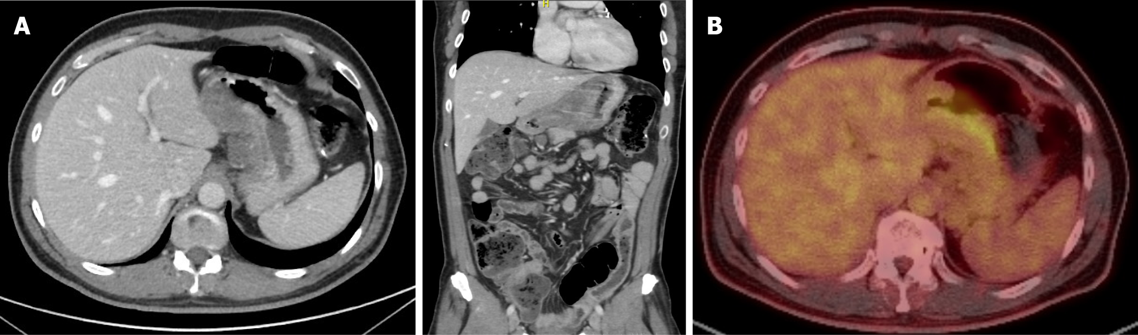 A: Computed tomography (CT) scan of the chest, abdomen and pelvis scan showing a mural thickening of the lesser curvature of stomach reaching the antrum, associated with locoregional lymphadenopathy; B: Whole positron emission tomography/CT scan showing FDG avid gastric thinking.