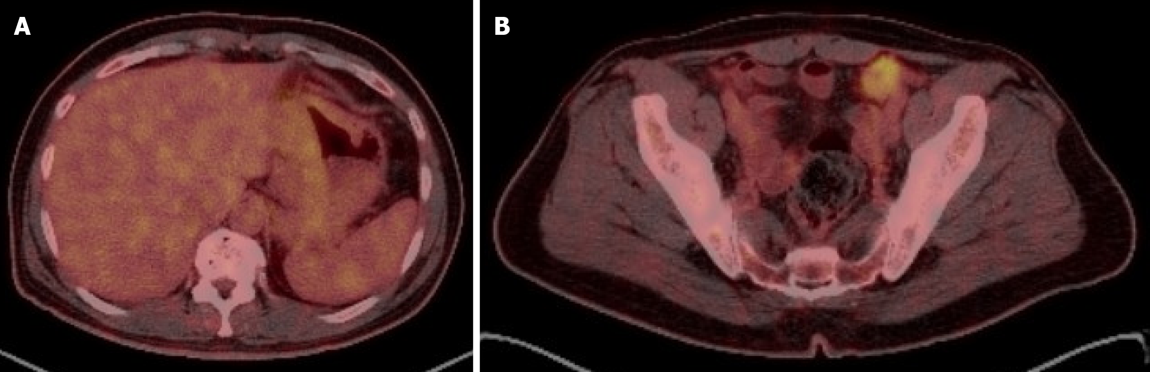 A: Whole body positron emission tomography/computed tomography scan post-neoadjuvant chemotherapy showing A-significant interval metabolic activity regression of the previously noted gastric lesser curvature FDG avid thickening and complete metabolic remission of the previously noted locoregional lymphadenopathy; B: New FDG uptake in an ileal bowel loop that was reported as inflammatory/infectious.