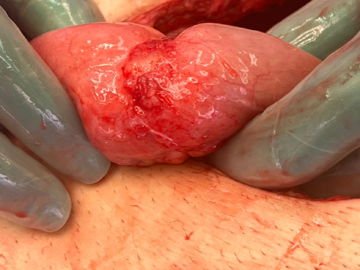 Intraoperative picture during the first exploration showing a small bowel mass at 40 cm proximal to the ileocecal valve.
