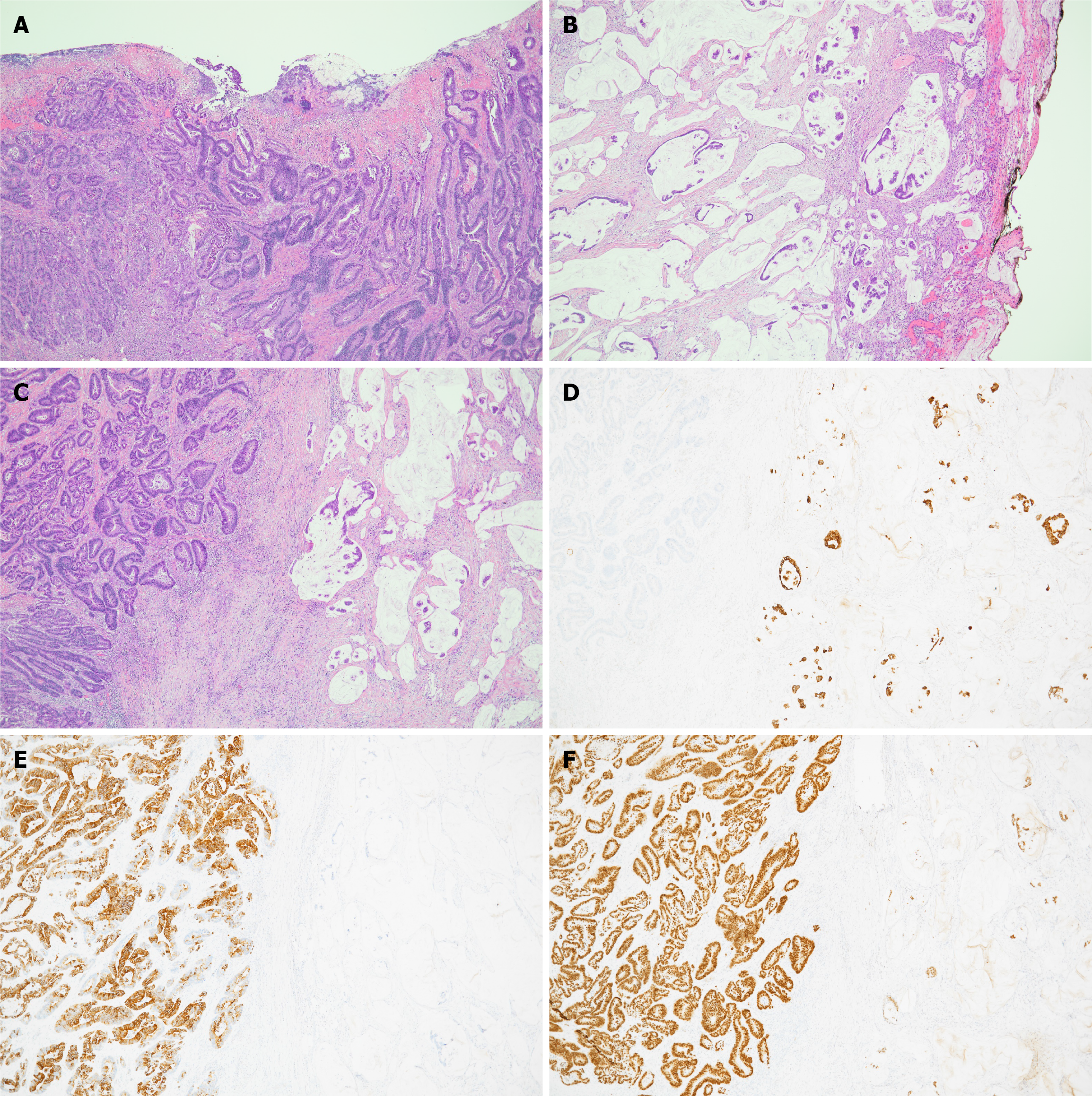A: A primary small bowel moderately differentiated adenocarcinoma; B: A metastatic Gastric mucinous adenocarcinoma; C: Co-existing primary small bowel adenocarcinoma (left) and metastatic gastric mucinous adenocarcinoma (right); D: Cytokeratin 7 immunohistochemical stain highlights the gastric adenocarcinoma; E and F: Cytokeratin 20 and CDX-2 immunohistochemical stains highlight the small bowel adenocarcinoma.