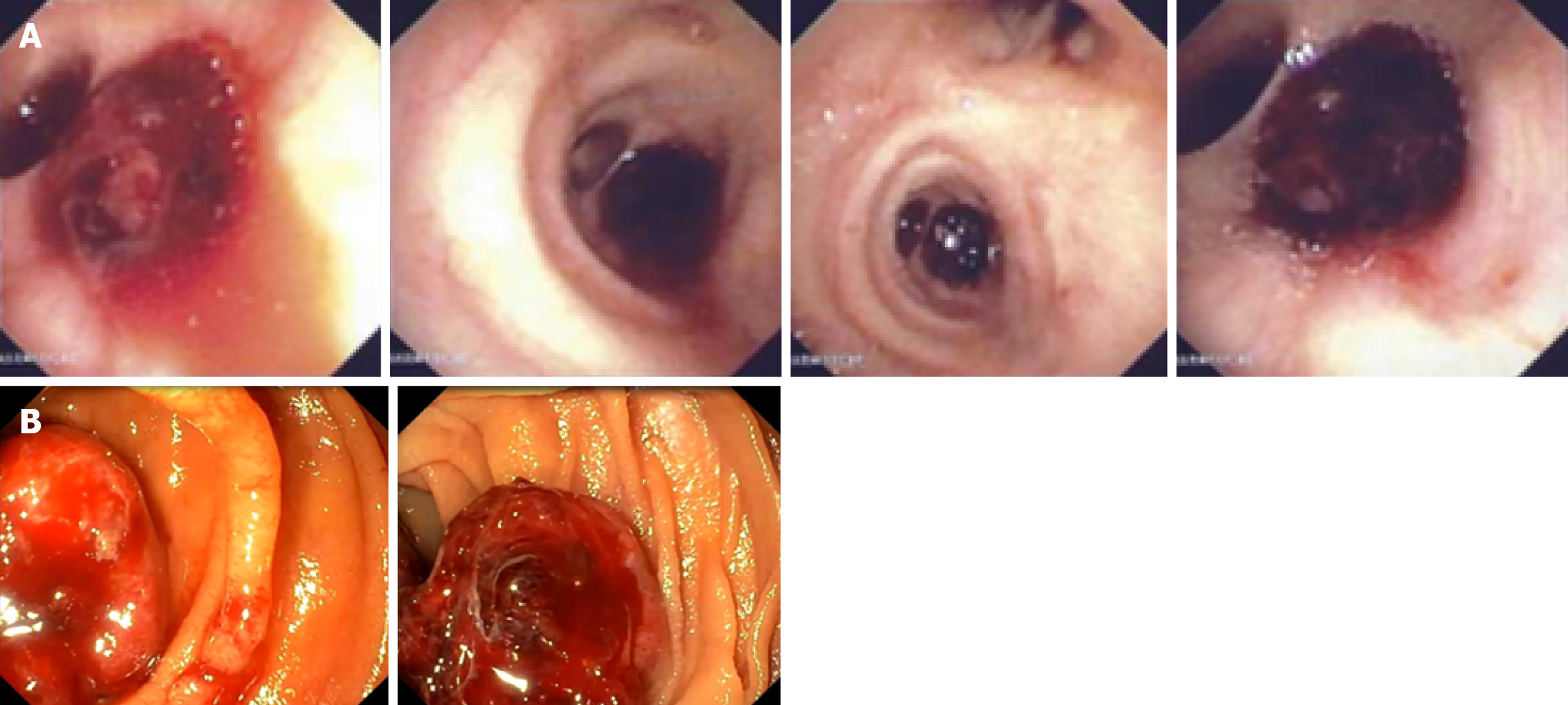 A: Minor bleeding at the level of the esophagus; B: Multiple blood clots in the proximal jejunum.