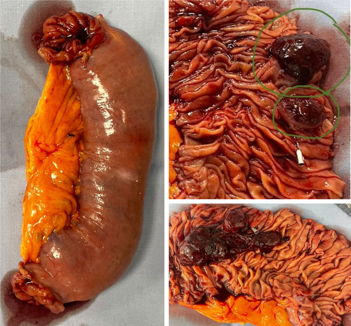 Resected jejunal segment showing two hemorrhagic polypoid tumors, one marked with a hemostatic clip.