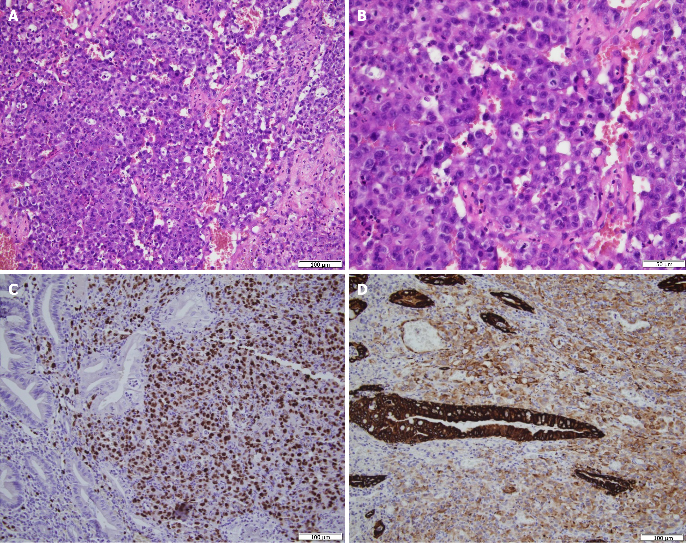 A: Hematoxylin and eosin (HE) stain, medium magnification (×20); B: HE stain, high magnification (×40); C: Immunohistochemical staining for cytokeratin; D: Immunohistochemical staining for ERG.