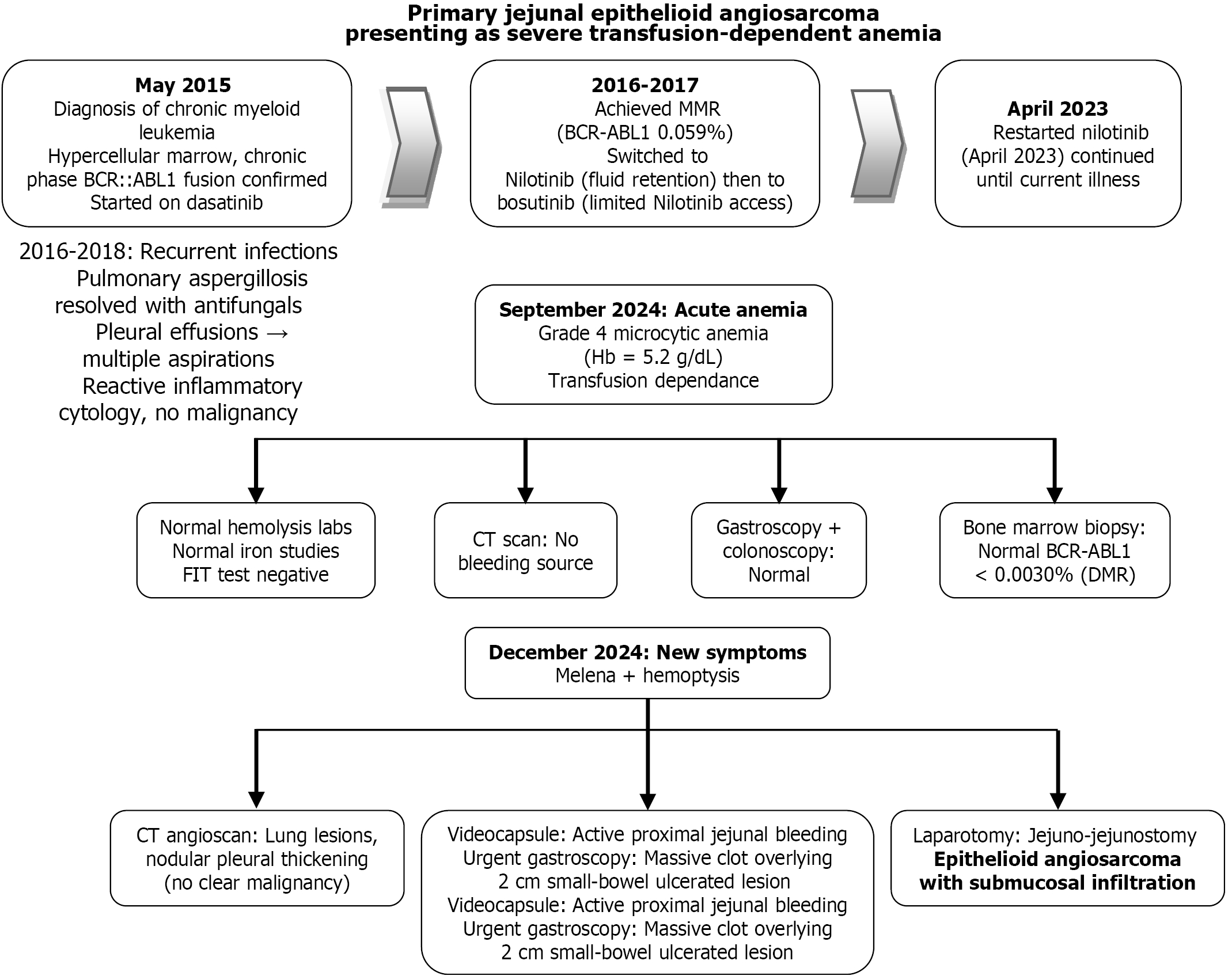 - Citation: Najdi T, Seif S, Khoury D, Kahwagi A, Wehbe P, Karam R, El Halabi L, Slim R, Chakhtoura G, Trak V, Eid R. Occult intestinal angiosarcoma presenting as refractory anemia during tyrosine kinase inhibitor therapy for chronic myeloid leukemia: A case report. World J Gastrointest Oncol 2026; 18(4): 116365