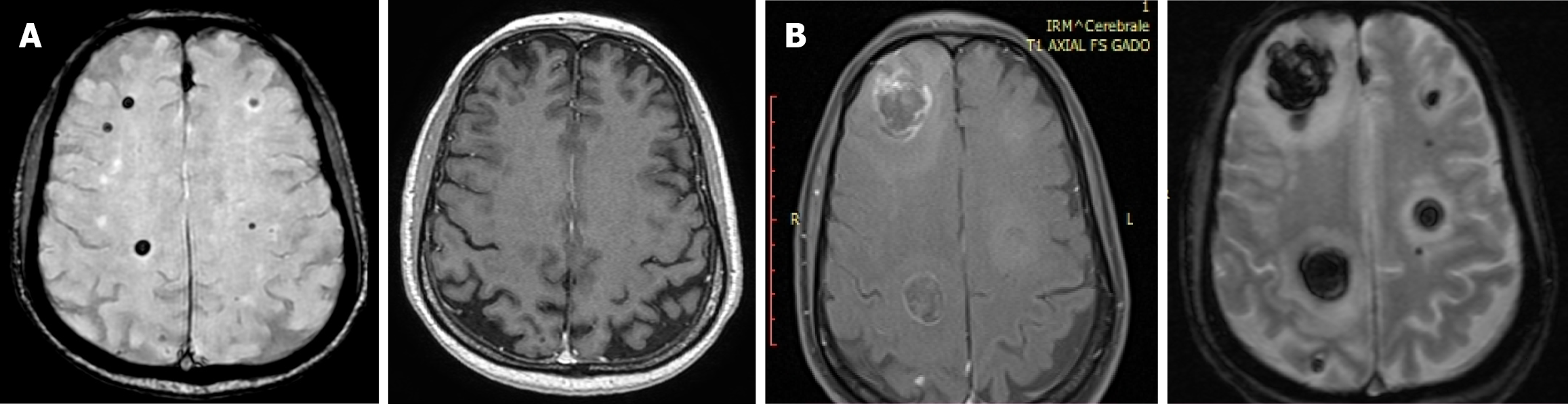 A: Axial magnetic resonance imaging (magnetic resonance imaging [MRI]; December 16, 2024): Right hemispheric nodular lesions (0.5 cm and 0.6 cm), no contrast enhancement pre- or post-contrast; B: Axial MRI (January 23, 2025): Marked lesion enlargement (2.0 cm and 2.5 cm) with minimal contrast enhancement.