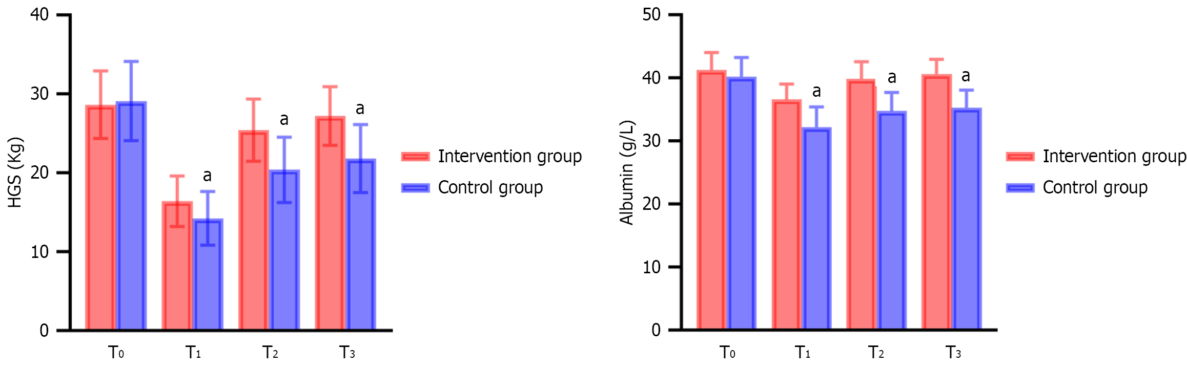 Figure 1 Statistical comparison of handgrip strength and serum albumin levels in two patient groups at different time points.