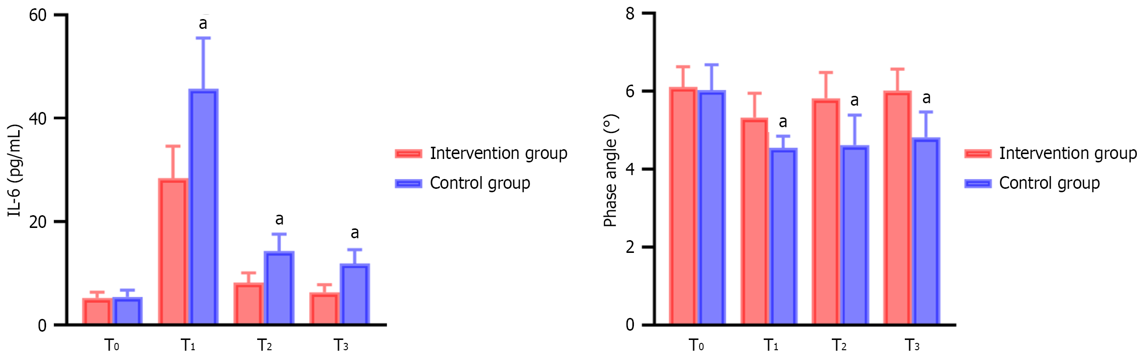 Figure 2 Statistical comparison of interleukin-6 and phase angle levels in two patient groups at different time points.