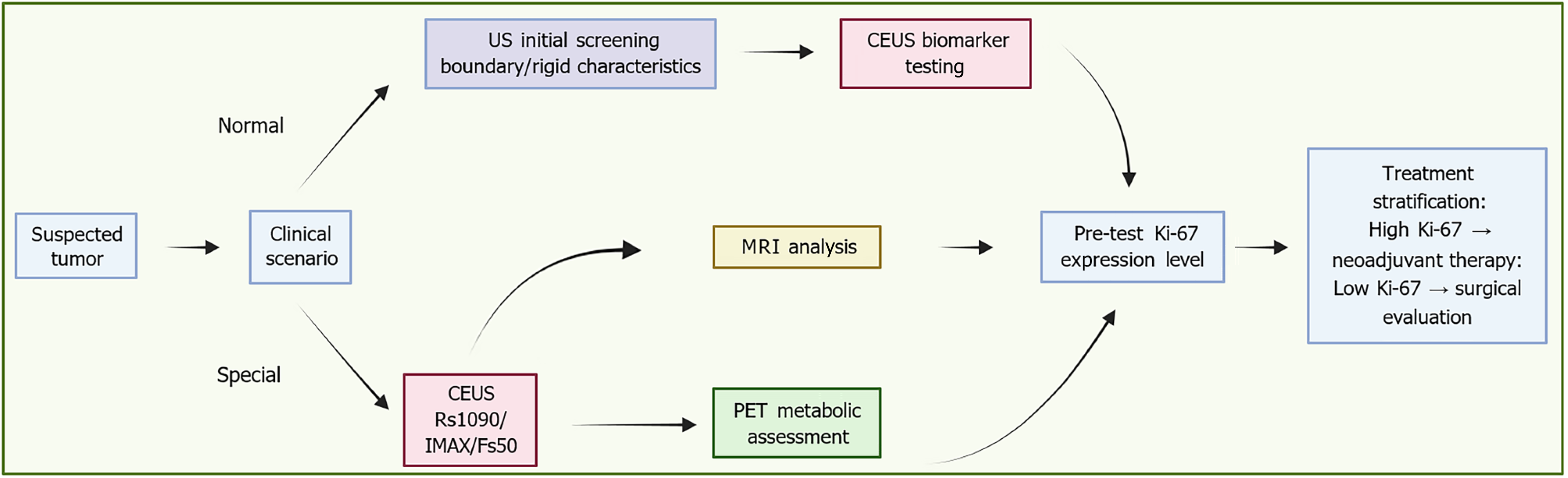 An integrated clinical pathway for tumor management involves initial screening via ultrasound to assess boundary and rigid features, followed by contrast-enhanced ultrasound biomarker testing. This testing includes quantitative parameters such as rise slope 10%-90%, maximum intensity, and falling slope 50%. Contrast-enhanced ultrasound testing serves as a trigger for multiparametric magnetic resonance imaging, which is used for apparent diffusion coefficient and Ki-67 assessment. Treatment is stratified by Ki-67 expression: High expression mandates neoadjuvant therapy, while low expression proceeds directly to surgical evaluation. The employment of advanced quantification techniques and positron emission tomography metabolic assessment further reinforces the precision oncology decision-making process throughout the pathway. US: Ultrasound; CEUS: Contrast-enhanced ultrasound; Rs1090: Rise slope 10%-90%; IMAX: Maximum intensity; Fs50: Falling slope 50%; MRI: Magnetic resonance imaging; PET: Positron emission tomography.