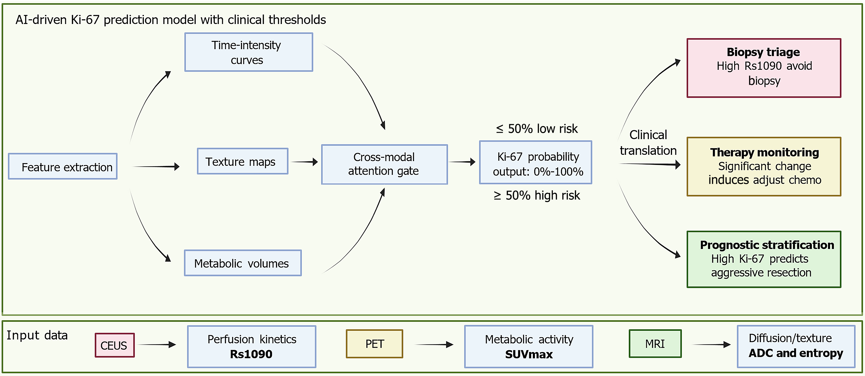 This schematic presents an artificial intelligence fusion model that integrates multimodal imaging data. These include contrast-enhanced ultrasound derived perfusion kinetics, specifically rise slope 10%-90%, positron emission tomography based metabolic activity represented by the maximum standardized uptake value, and magnetic resonance imaging derived diffusion and texture metrics such as apparent diffusion coefficient and entropy. The model extracts key imaging features including time-intensity curves, metabolic volumes, and texture maps, which are then synthesized using a cross-modal attention gate to generate a probabilistic Ki-67 output ranging from 0%-100%. Clinically, this artificial intelligence-derived output supports three major decisions. First, biopsy triage, where a high rise slope 10%-90% value may help avoid invasive procedures in patients at risk for biopsy-related complications. Second, therapy monitoring, where significant changes in perfusion parameters or rising maximum standardized uptake values during neoadjuvant treatment can prompt early adjustments to chemotherapy. Third, prognostic stratification, where high-probability Ki-67 spatial predictions assist in identifying aggressive tumor regions and support surgical margin planning. AI: Artificial intelligence; Rs1090: Rise slope 10%-90%; CEUS: Contrast-enhanced ultrasound; PET: Positron emission tomography; SUVmax: Maximum standardized uptake value; MRI: Magnetic resonance imaging; ADC: Apparent diffusion coefficient.