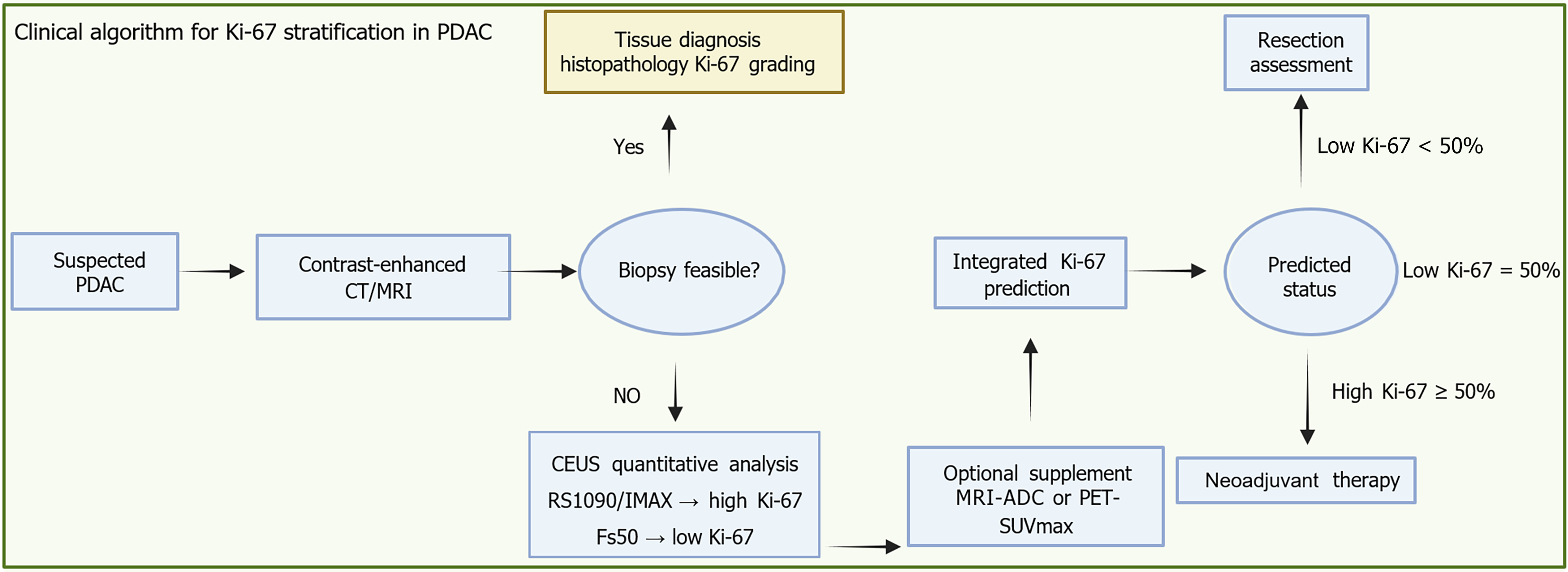 This clinical workflow outlines a decision-making pathway for suspected pancreatic ductal adenocarcinoma, integrating imaging biomarkers to support personalized treatment planning. Following initial contrast-enhanced computed tomography or magnetic resonance imaging for anatomical staging, the feasibility of tissue biopsy is assessed. If biopsy is possible, histopathological Ki-67 grading provides a direct evaluation of tumor proliferative activity. When biopsy is not feasible - such as in patients on anticoagulation therapy or with poor clinical condition - noninvasive contrast-enhanced ultrasound becomes essential. Quantitative contrast-enhanced ultrasound parameters, including elevated rise slope 10%-90% or maximum intensity, are indicative of high Ki-67 expression (≥ 50%), while a low 50% falling slope suggests low Ki-67 expression (< 50%). Optional supplementary imaging, such as magnetic resonance imaging-derived apparent diffusion coefficient or positron emission tomography-derived maximum standardized uptake value, may further enhance risk stratification when needed. These multimodal imaging biomarkers are then integrated via an artificial intelligence-based model to generate a probabilistic Ki-67 score. Based on this prediction, patients are stratified into two therapeutic pathways: Those with high predicted Ki-67 (≥ 50%) are directed toward neoadjuvant therapy due to increased proliferative risk, while those with low predicted Ki-67 (< 50%) are considered suitable for surgical resection planning. PDAC: Pancreatic ductal adenocarcinoma; CT: Computed tomography; MRI: Magnetic resonance imaging; CEUS: Contrast-enhanced ultrasound; Rs1090: Rise slope 10%-90%; IMAX: Maximum intensity; Fs50: Falling slope 50%; ADC: Apparent diffusion coefficient; PET: Positron emission tomography; SUVmax: Maximum standardized uptake value.