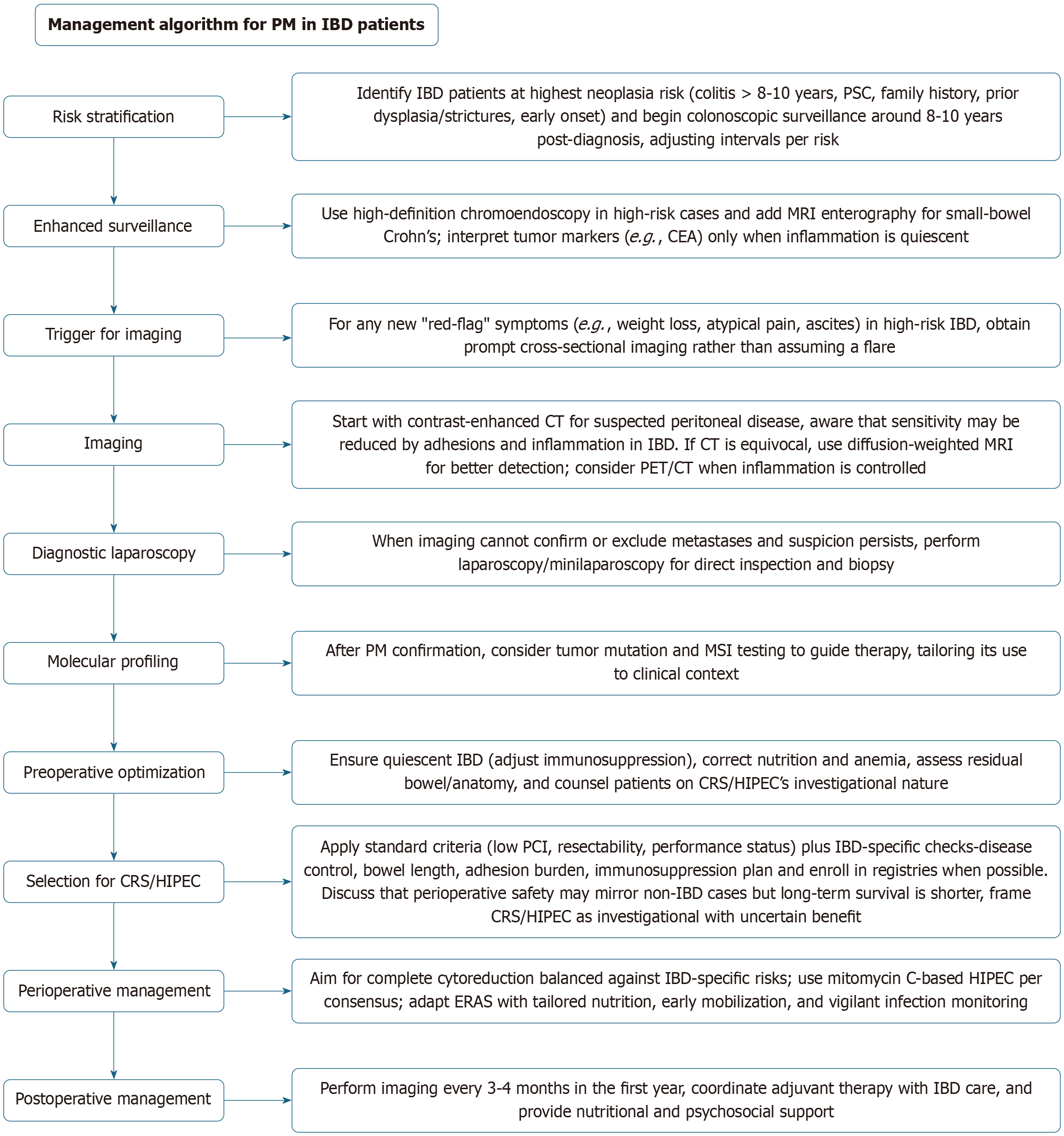 Patients with IBD who develop PM require a nuanced, evidence-aligned approach beginning with rigorous risk stratification and vigilant surveillance. High-risk features should trigger intensified endoscopic monitoring in keeping with European Crohn’s and Colitis Organization and American Gastroenterological Association guidelines that recommend initiating surveillance colonoscopy around 8-10 years after diagnosis and adjusting intervals based on risk factors[36,46-48]. In CD with small-bowel involvement, adjunctive magnetic resonance enterography is appropriate to detect neoplastic lesions beyond the reach of colonoscopy. When patients at high risk present with new or atypical symptoms, such as unexplained weight loss, persistent abdominal pain, or ascites, clinicians must promptly pursue cross-sectional imaging rather than presume an IBD flare. Contrast-enhanced CT remains the initial modality for suspected peritoneal disease. If CT is equivocal, DW-MRI offers enhanced soft-tissue contrast, and PET/CT may further delineate metabolically active implants when inflammation is controlled. Early diagnostic laparoscopy should follow inconclusive imaging in the setting of persistent suspicion as direct visualization and biopsy constitute the diagnostic gold standard. Molecular profiling of confirmed PM can be pursued in accordance with general oncology protocols[44,49-51].