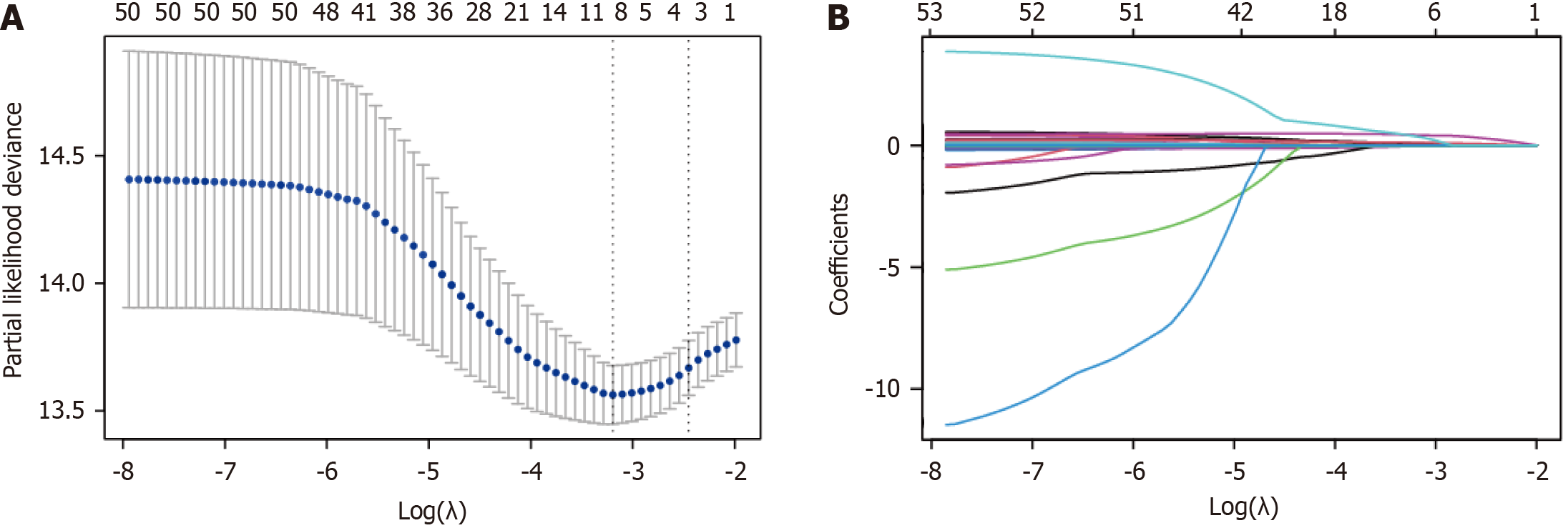 The dataset was divided into a training set and a validation set at a 7:3 ratio using the Light Gradient Boosting Machine algorithm, maintaining a consistent proportion of positive to negative samples across both subsets. Within the training set, least absolute shrinkage and selection operator (LASSO) Cox regression was employed for multivariate analysis. Compared to the traditional stepwise Cox regression approach, the LASSO-Cox regression offers a potentially more precise and interpretable risk prediction model by reducing the variance of the estimates.
