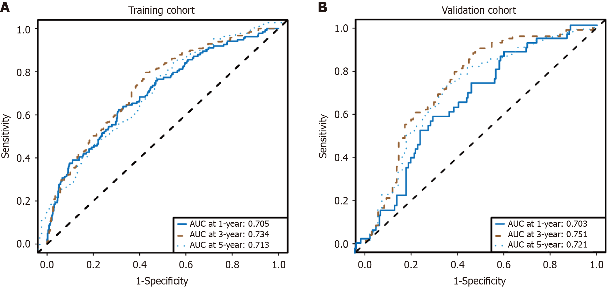 As expected, the model exhibited strong predictive performance in the training cohort for 1-year [area under the curve (AUC) = 0.705], 3-year (AUC = 0.734), and 5-year (AUC = 0.713) survival rates (Figure 3A). The ROC curves from the internal validation cohort also revealed that the survival nomogram possessed a reliable predictive ability for 1-year and 3-year survival, with AUC values of 0.703 and 0.751, respectively, and an AUC of 0.721 for 5-year survival (Figure 3B).