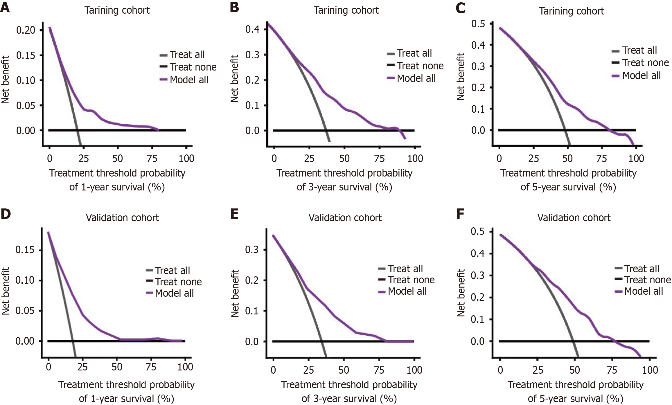 Model validation revealed that the AUC for all variables was approximately 0.7 or higher, suggesting high predictability and accuracy. The ROC curves for individual prognostic factors were inferior to that of the composite model, indicating strong predictive capability. Moreover, DCA has been widely recognized, demonstrating its usefulness and value in clinical decision-making[33]. Consequently, DCA was performed, and the findings indicated that the predictive model offered superior clinical utility compared to isolated risk factors. Utilizing the risk score derived from the model, the patient cohort was divided into low-risk and high-risk categories. Kaplan-Meier survival analysis revealed a superior prognosis for the low-risk group relative to the high-risk group, corroborating the clinical relevance of the model.