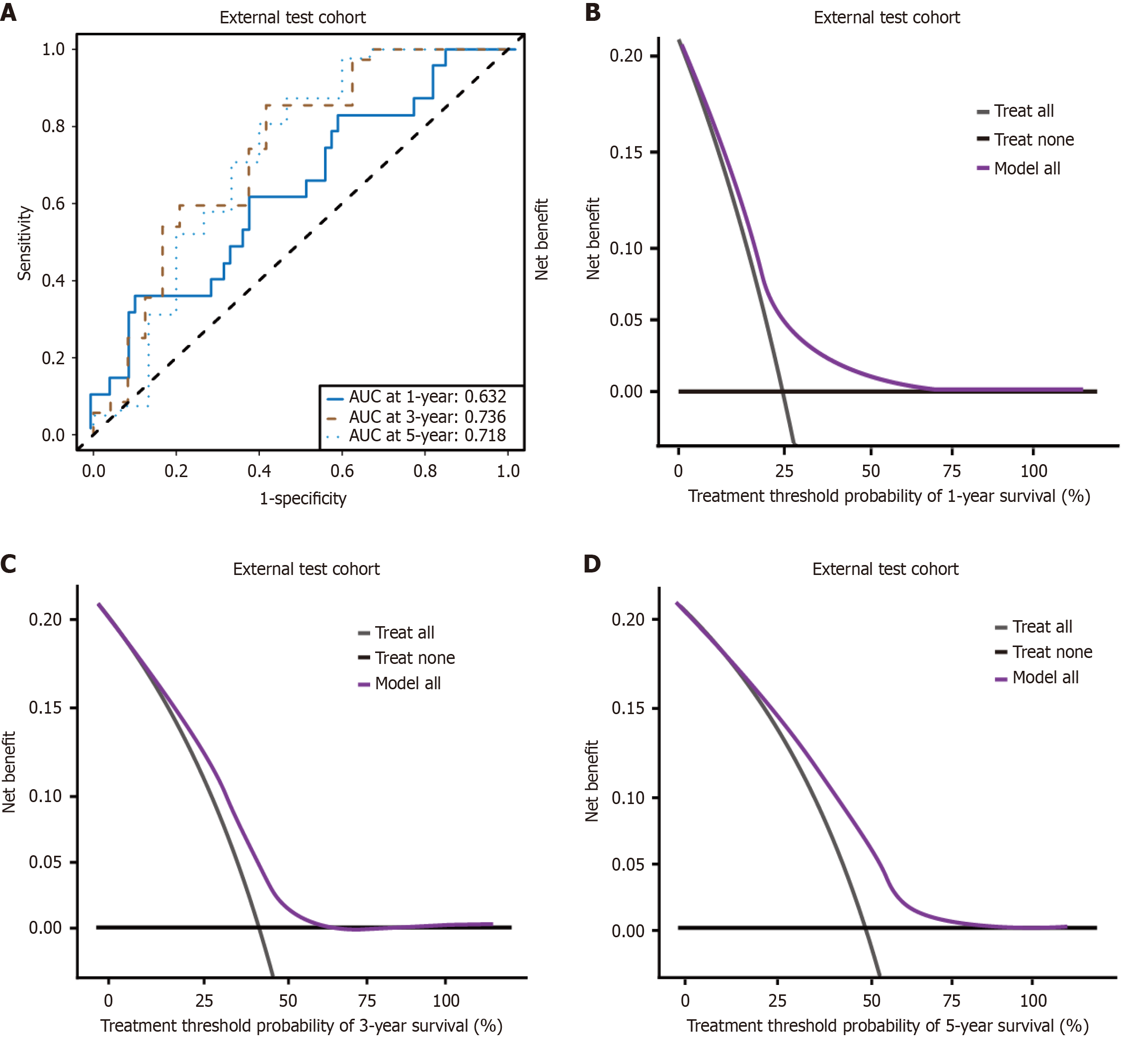 The ROC curves for the external test cohort demonstrated robust predictive performance, with AUC values of 0.632, 0.738, and 0.718 for 1-year, 3-year, and 5-year survival rates, respectively (Figure 5A). These AUC values indicate satisfactory discriminative ability of the model in an independent patient population. Furthermore, the DCA results for the external test cohort provided evidence of the clinical utility of the established nomogram (Figure 5B-D).