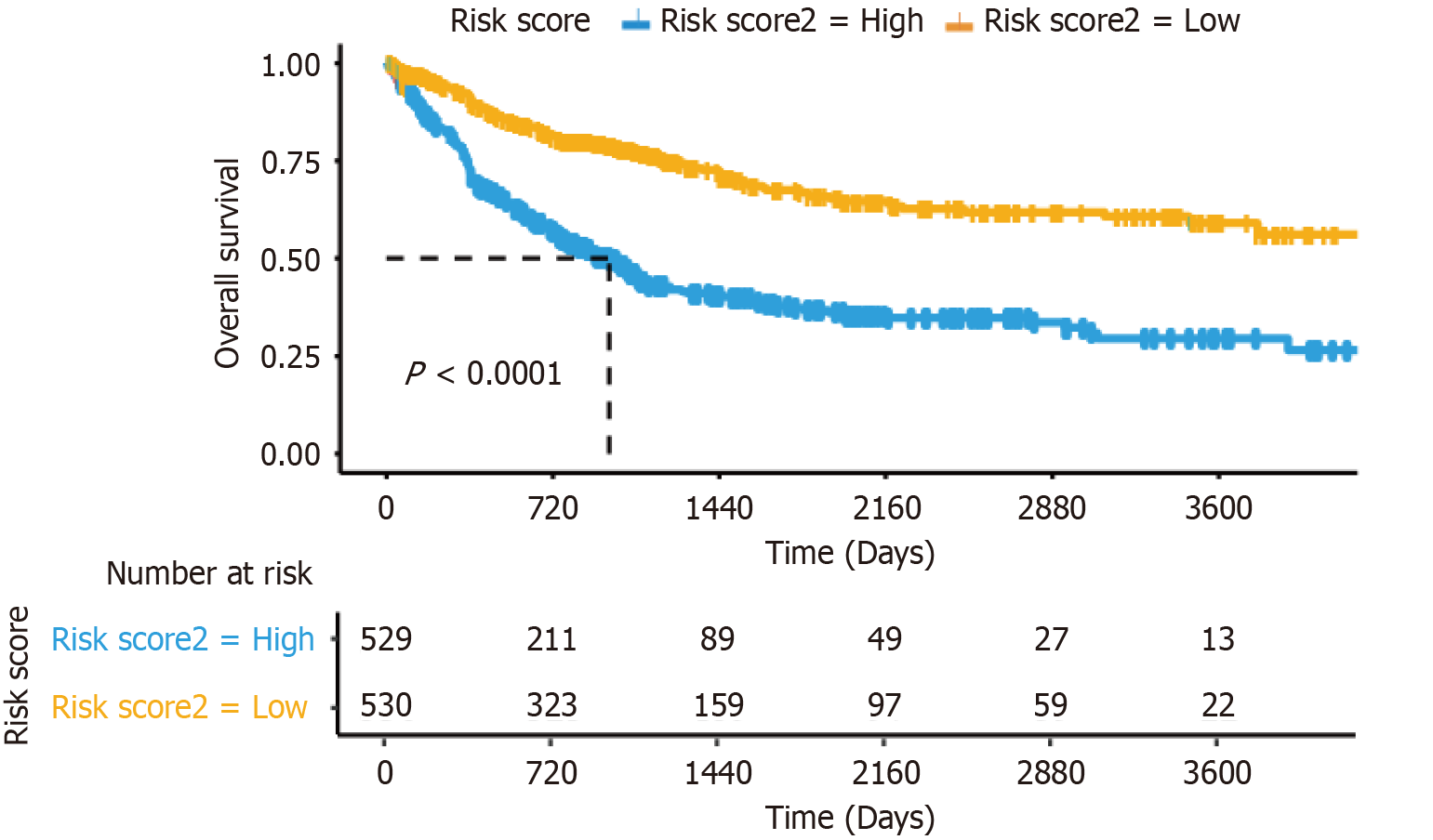 The survival prediction nomogram exhibited a high degree of accuracy in predicting outcomes. Utilizing the five parameters incorporated into the model, patients were categorized into low-risk and high-risk groups based on a median risk score, which facilitated their prognostic stratification. Kaplan-Meier survival analysis demonstrated a notable disparity in survival rates between the low-risk group, consisting of 530 patients, and the high-risk group, comprising 529 patients (P < 0.001; Figure 6). These findings underscore the utility of a risk stratification system based on liver metastasis for accurately predicting patient outcomes.