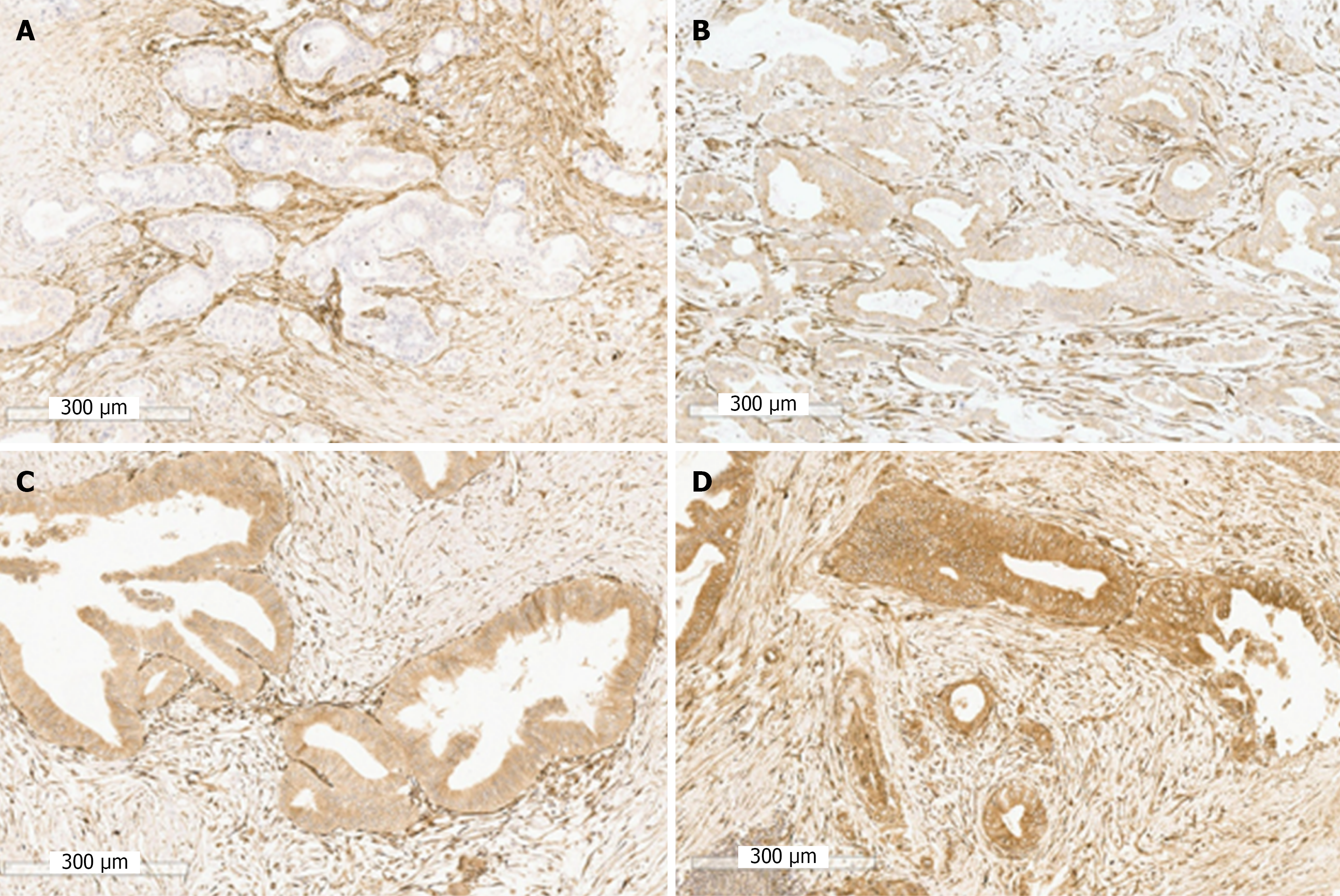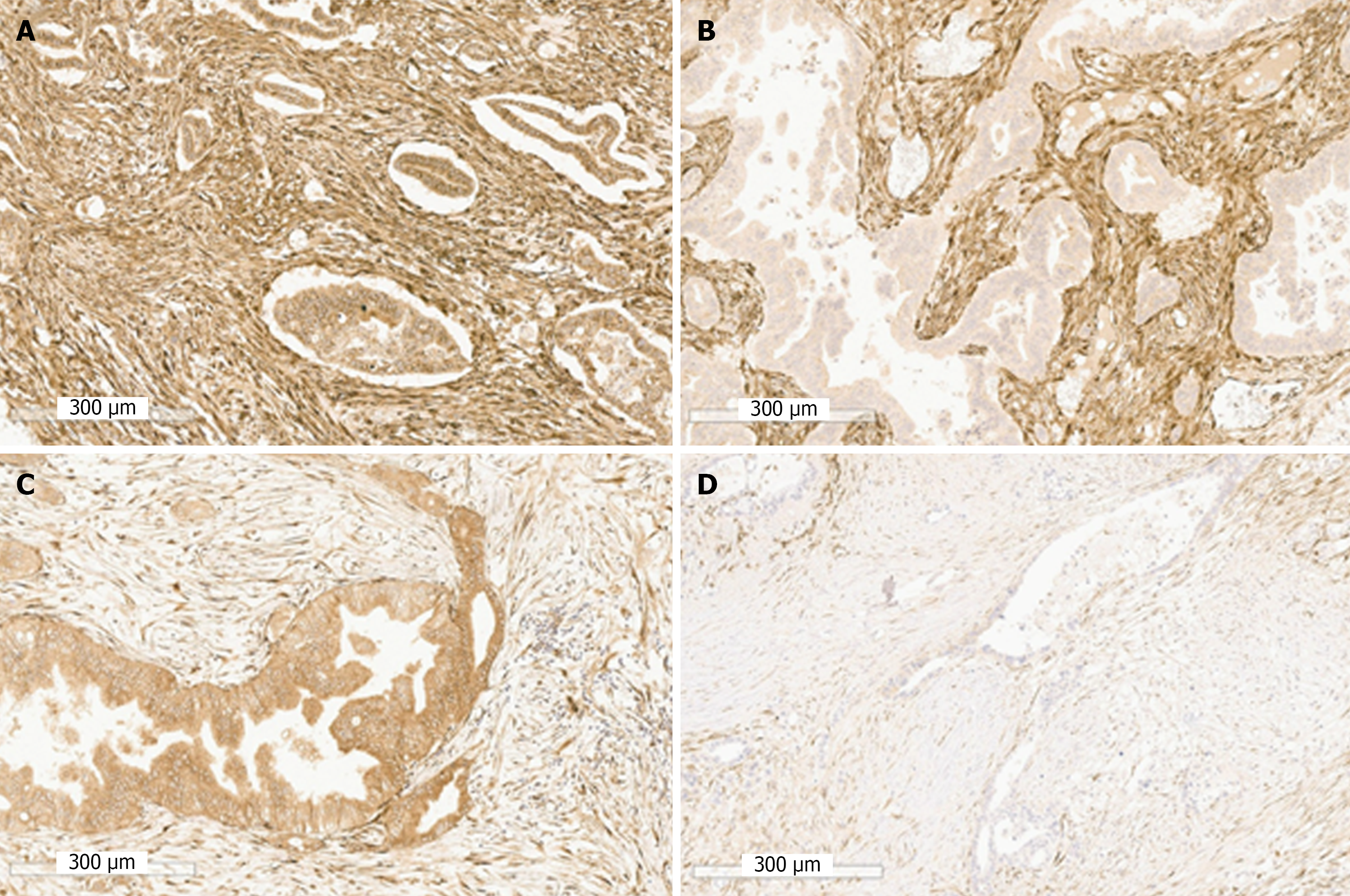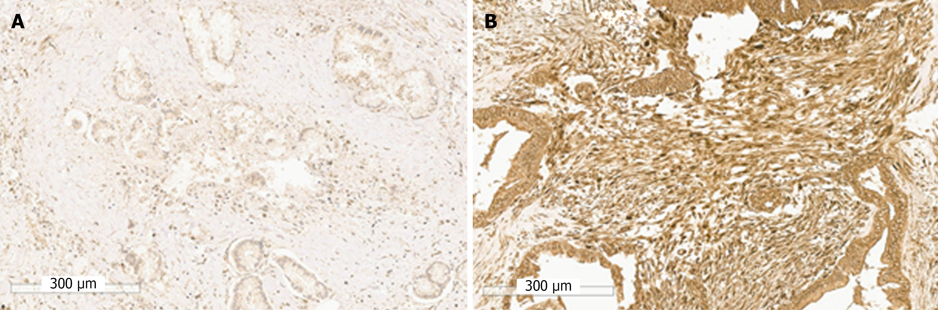 The proportion of tumor cells with cytoplasmic staining was used to assess cytoplasmic SPARC (cSPARC) expression. The staining intensity was graded as negative (0), weak (1), moderate (2), or strong (3) (Figure 1). In accordance with the criteria described by Sinn et al[37], cSPARC positivity was defined as either > 50% of tumor cells with moderate to strong intensity or > 10% of tumor cells with strong intensity (immunoreactive score ≥ 3). The SPARC antibody showed high and homogeneous stromal staining in fibroblasts, as reported by Hidalgo et al[38]. sSPARC expression was assessed based on the percentage of fibroblasts exhibiting strong cytoplasmic staining, as described by Hidalgo et al[38]. Based on the distribution of stromal staining patterns and in line with previous literature, sSPARC positivity was defined as strong staining in ≥ 50% of stromal fibroblasts (Figure 2), whereas sSPARC negativity was defined as staining in < 50% stromal fibroblasts (Figure 2).
