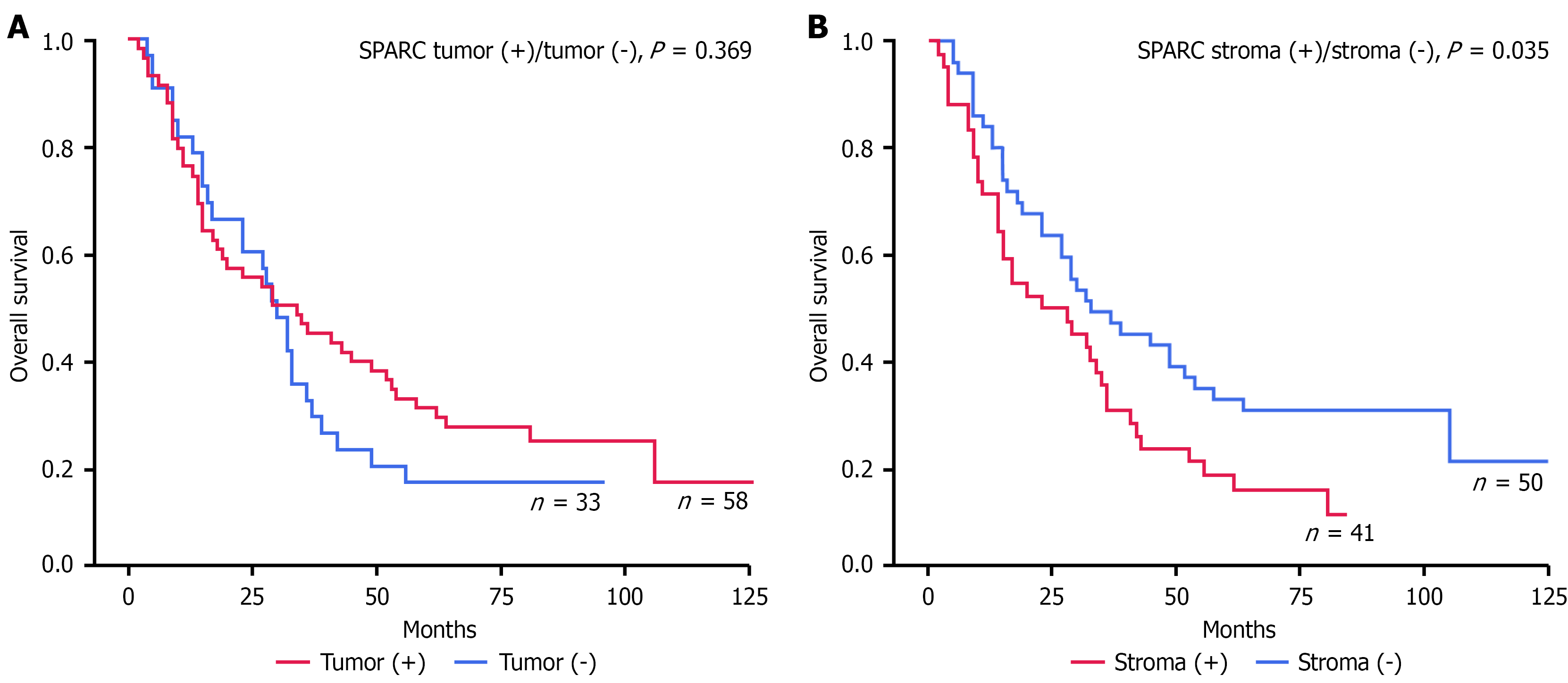 A: Overall survival difference according to secreted protein acidic and rich in cysteine expression in cancer tissue; B: Overall survival difference according to secreted protein acidic and rich in cysteine expression in stroma of the tumor. SPARC: Secreted protein acidic and rich in cysteine.
