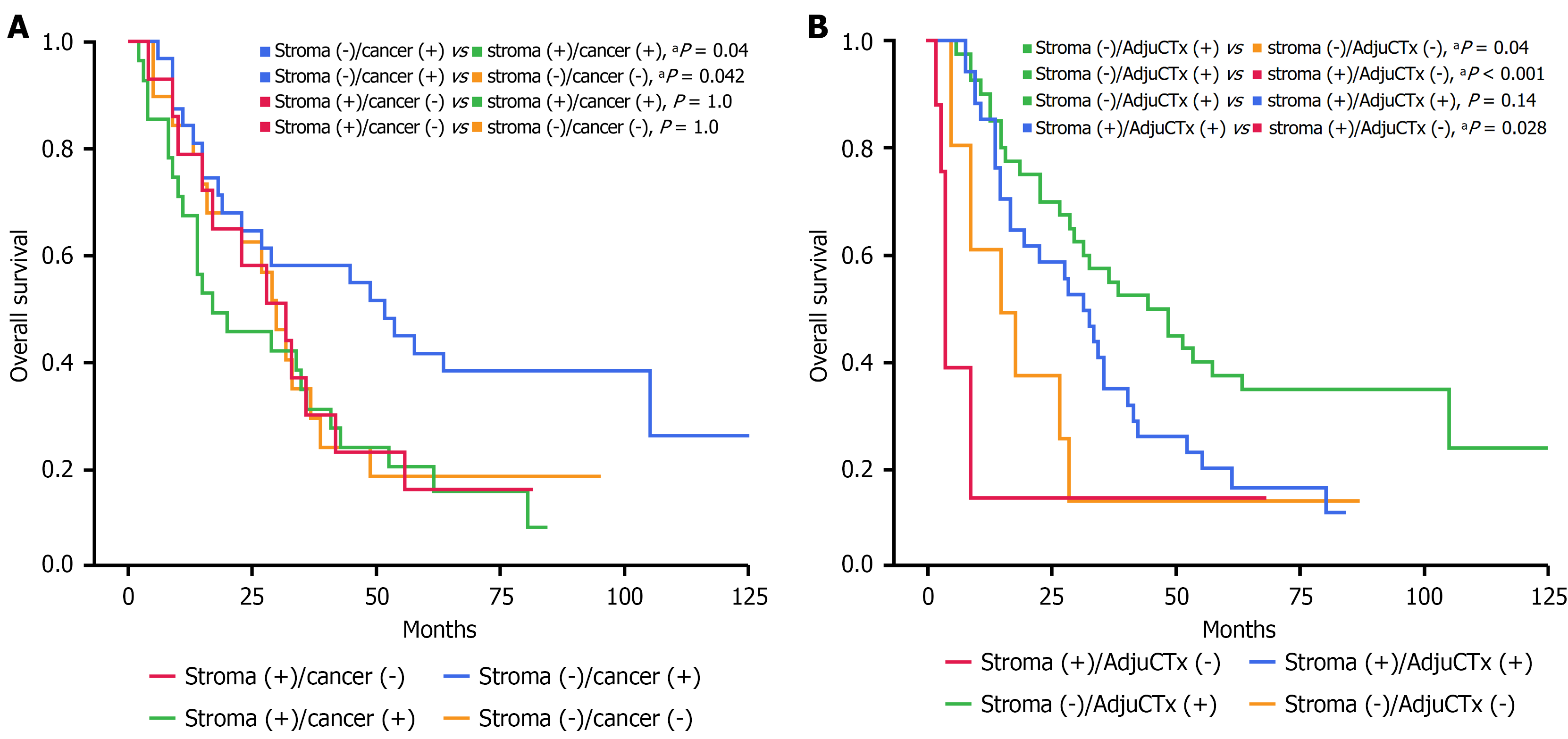 A: According to secreted protein acidic and rich in cysteine expression in stroma and cancer cells; B: According to secreted protein acidic and rich in cysteine expression and postoperative adjuvant chemotherapy. P indicates Bonferroni-corrected P value. aP < 0.05 was considered statistically significant. AdjuCTx: Adjuvant chemotherapy.