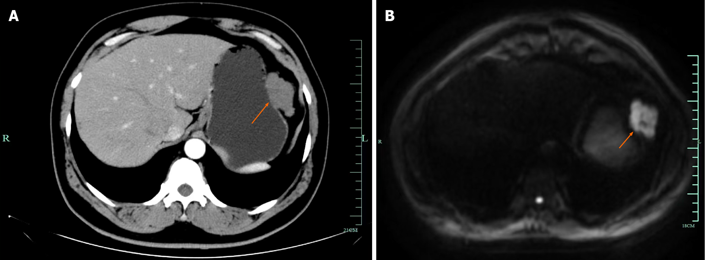 Case 1: A contrast-enhanced CT of the abdomen showed a large, well-circumscribed, exophytic mass originating from the greater curvature of the stomach, measuring approximately 5.0 cm × 6.0 cm (Figure 1A). Enhanced magnetic resonance imaging of the stomach revealed an irregular mass-like abnormal signal focus in the greater curvature of the gastric fundus, with a clear edge, approximately 53 mm × 34 mm in size. The mass showed high signal on T2-weighted imaging and diffusion weighted imaging, low signal on T1-weighted imaging, and significant enhancement post-contrast (Figure 1B). The imaging findings were suggestive of a mass in the gastric fundus on the greater curvature, considered a solid tumor (extrinsic growth type).