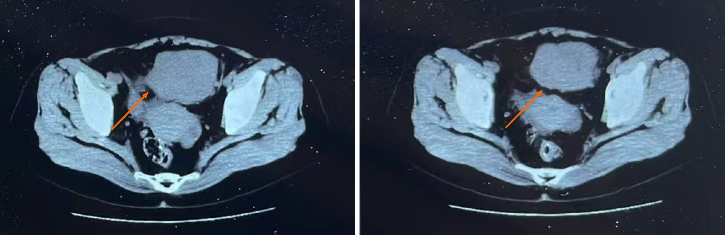 Case 2: CT scan revealed a solid mass lesion in the small intestine within the abdominal cavity (Figure 2).