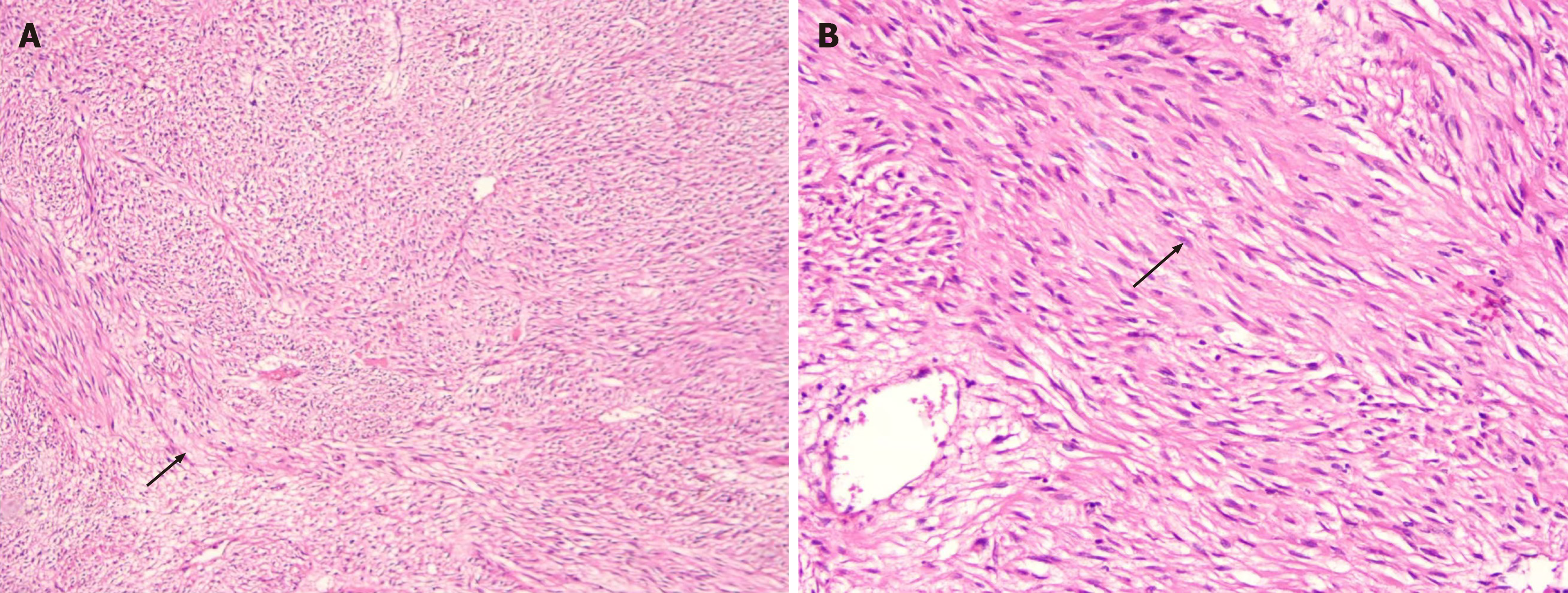 Pathological diagnosis confirmed a moderately risky GIST. Microscopic examination confirmed a spindle cell type GIST (Figure 3A). The tumor size was 5.8 cm × 5.5 cm × 4.0 cm, with a mitotic rate of < 5/5 mm2. Immunohistochemical results were: Creatine kinase (full specimen) (-), S-100 (-), smooth muscle actin (SMA) (-), anaplastic lymphoma kinase (-), SOX10 (-); Desmin (+), cluster of differentiation (CD) 34 (+), trimethylated histone H3 at lysine 27 (+); CD117 (partially +); DOG1 (strongly +); β-catenin(cytoplasmic +); SDHB expression was retained; Ki-67 proliferation index was approximately 2%.