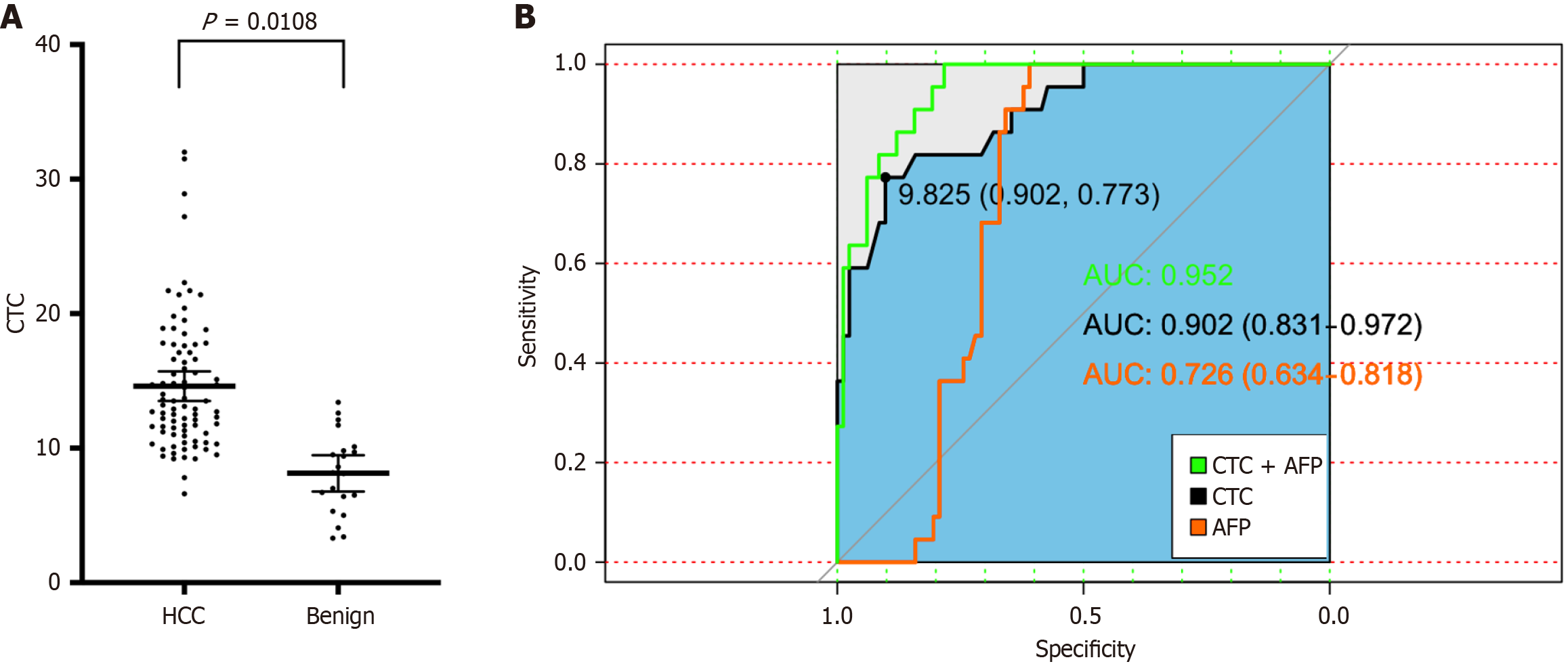 The FR + CTC counts were compared between the malignant group (before treatment) and the benign group. The average CTC count in patients with benign disease was 8.1 ± 3.0 FU/3 mL, which was significantly lower than that in patients with HCC (14.61 ± 5.01 FU/3 mL; P = 0.0108; Figure 1A). The diagnostic efficiency of the FR + CTC count in distinguishing HCC from benign HCC disease was based on ROC curves. The area under the ROC curve was 0.9. The optimal FR + CTC level cutoff value for differentiating patients with HCC from those with benign HCC disease was 9.825 FU/3 mL. The sensitivity and specificity were 0.902 and 0.773, respectively (Figure 1B). Moreover, the diagnostic performance of AFP level and FR + CTC count combined with AFP level was also evaluated. The areas under the ROC curves of the FR + CTC count combined with the AFP level and the AFP level alone were 0.952 (0.830-0.972) and 0.73 (0.639-0.821), res