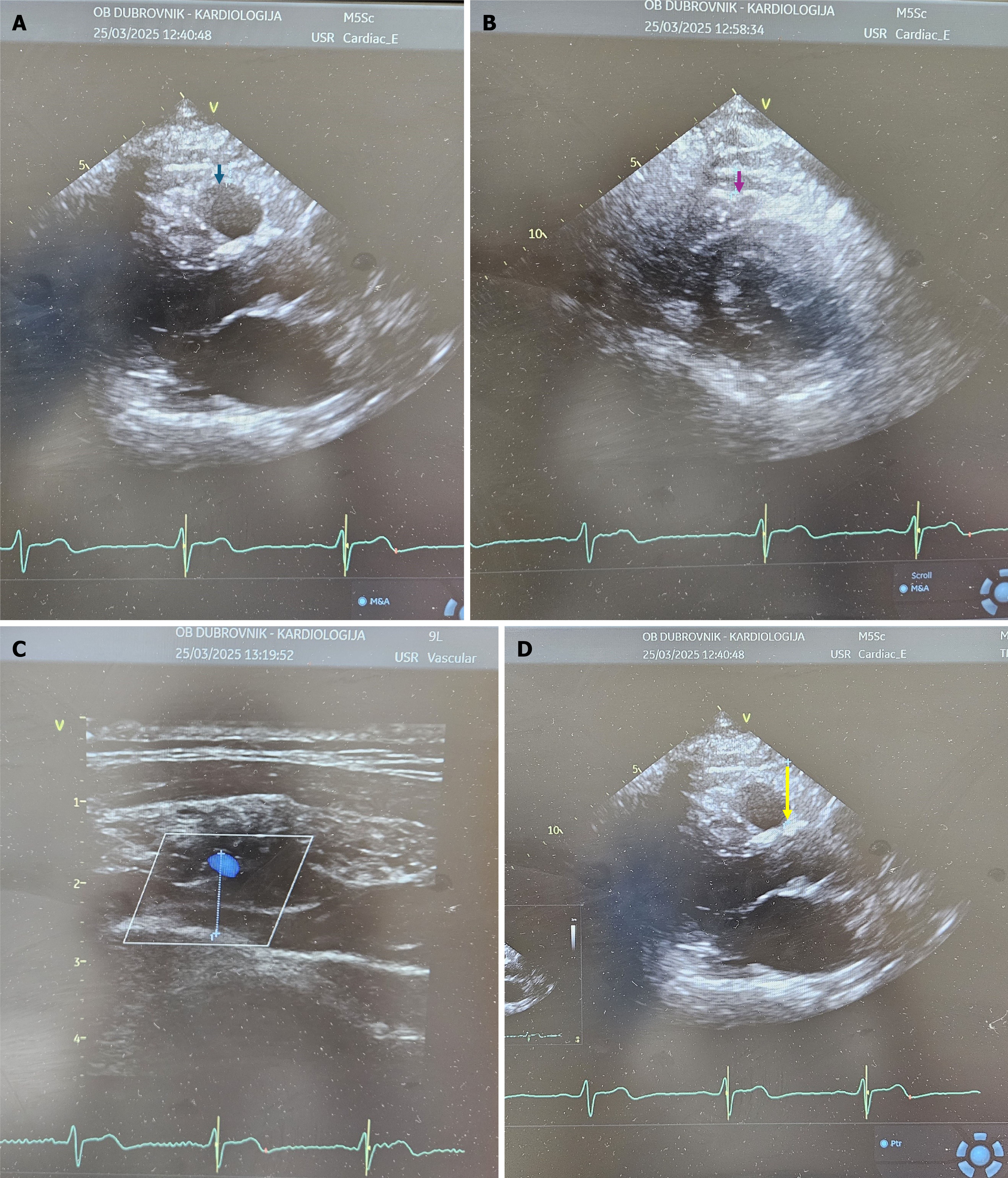 A: Measured from parasternal long-axis view (blue arrow); B: Measured from parasternal short-axis view (purple arrow); C: Measured from modified three-chamber view with a linear probe (dotted line); D: Measured from parasternal long-axis view at Rindfleisch fold (yellow arrow).