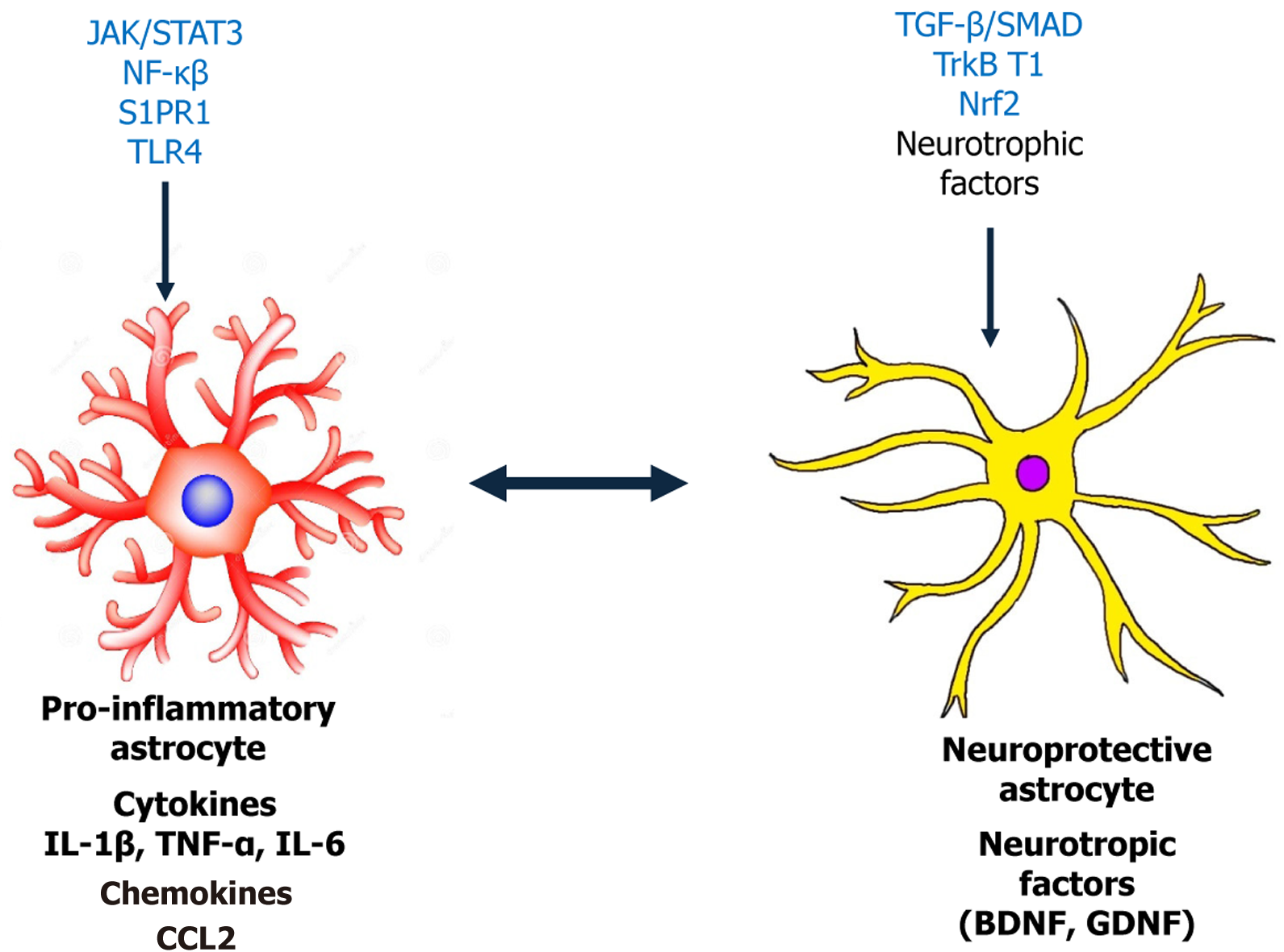 The left panel shows pro-inflammatory astrocytes, which become reactive in response to diabetic stressors. Activation is mediated by pathways such as Janus kinase/signal transducer and activator of transcription 3 (JAK/STAT3), nuclear factor kappa B (NF-κB), Toll-like receptor 4 (TLR4), and sphingosine-1-phosphate receptor 1 (S1PR1), leading to the release of cytokines [e.g., interleukin 1 beta (IL-1β), tumor necrosis factor alpha (TNF-α), interleukin 6 (IL-6)], chemokines [e.g., C-C motif chemokine ligand 2 (CCL2)], and neurotoxic factors that promote central sensitization and neuropathic pain. The right panel illustrates neuroprotective astrocytes, driven by signaling through nuclear factor erythroid 2-related factor 2 (Nrf2), transforming growth factor beta (TGF-β)/SMAD, and tyrosine receptor kinase B (TrkB.T1), which enhance the release of neurotrophic factors [e.g., brain-derived neurotrophic factor (BDNF), glial cell line-derived neurotrophic factor (GDNF)] and antioxidants. These cells contribute to synaptic maintenance, neuronal survival, and the resolution of inflammation.