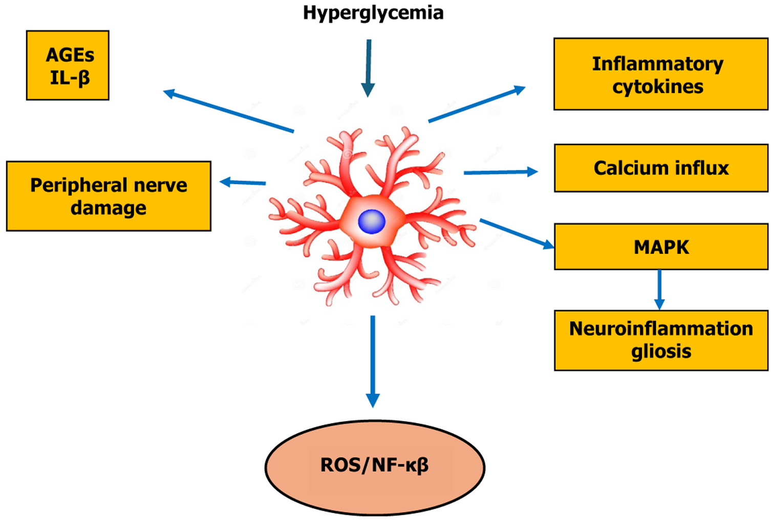 Under diabetic conditions, hyperglycemia activates astrocytes leading to increased reactive oxygen species (ROS) and nuclear factor kappa B (NF-κB) signaling. This cascade triggers the release of inflammatory cytokines, calcium influx, and mitogen-activated protein kinase (MAPK) activation, culminating in neuroinflammation and astrogliosis. The accumulation of advanced glycation end products (AGEs) and pro-inflammatory cytokines such as interleukin 1 beta (IL-1β) exacerbate peripheral nerve damage, creating a feedback loop that perpetuates astrocyte reactivity and neuronal dysfunction.