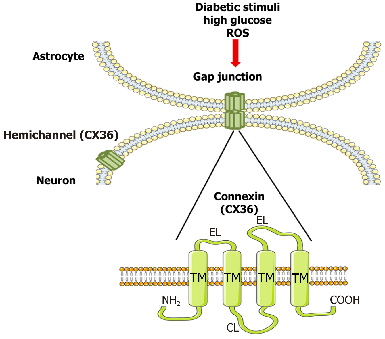 Under physiological conditions, connexin 36 (CX36) forms hexameric hemichannels that align to create gap junctions, enabling synchronized glial-neuronal signaling. Diabetic stressors alter CX36 expression and function, leading to disrupted intercellular communication and central sensitization. EL: Extracellular loop; ROS: Reactive oxygen species; TM: Transmembrane domain.
