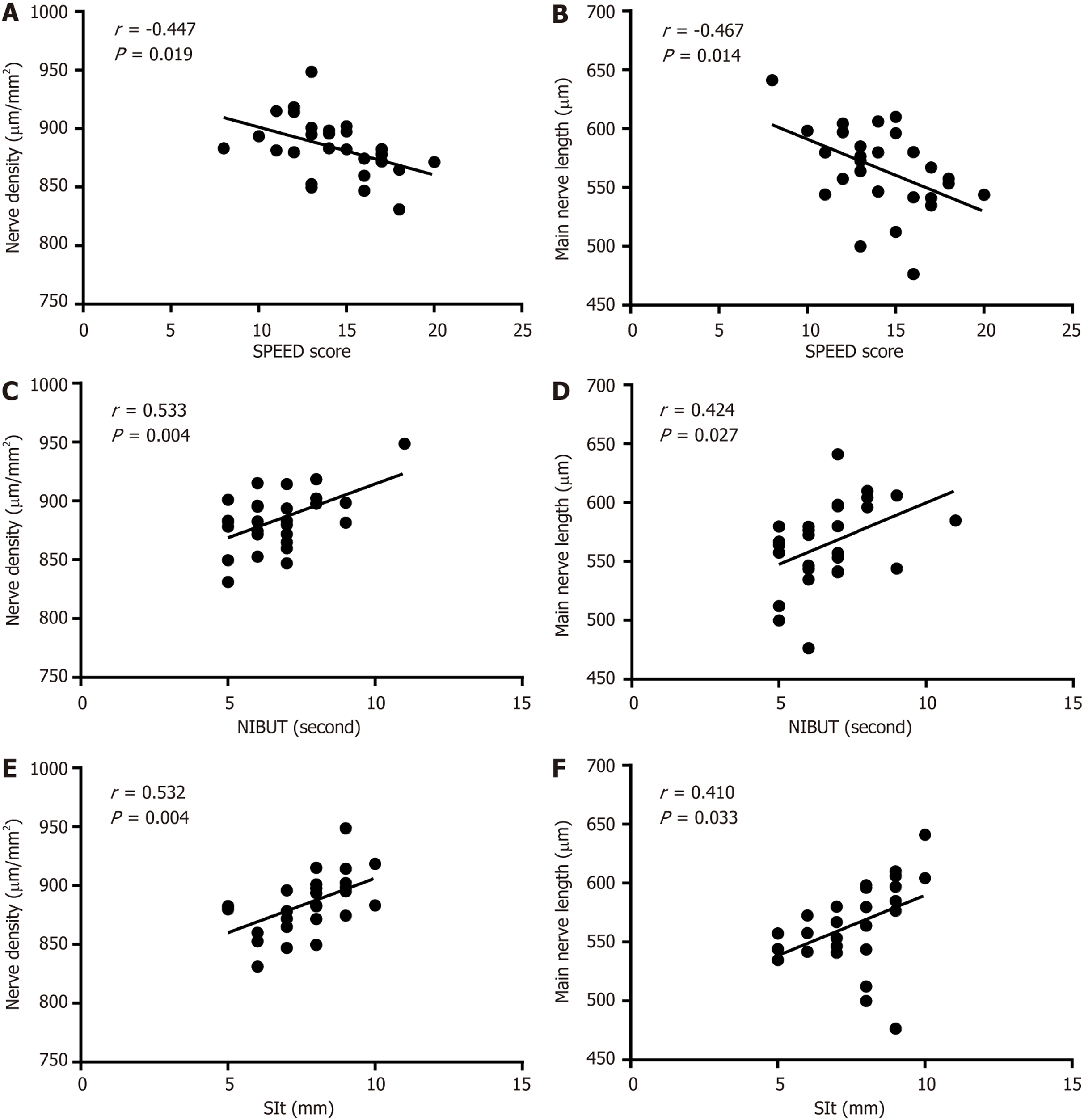 A: Correlation between standard patient evaluation of eye dryness (SPEED) score and nerve density; B: Correlation between SPEED score and main nerve length; C: Correlation between non-invasive tear film breakup time (NIBUT) and nerve density; D: Correlation between NIBUT and main nerve length; E: Correlation between Schirmer I test (Sit) and nerve density; F: Correlation between SIt and main nerve length. DES: Dry eye syndrome; SPEED: Standard patient evaluation of eye dryness; NIBUT: Non-invasive tear film breakup time; SIt: Schirmer I test.
