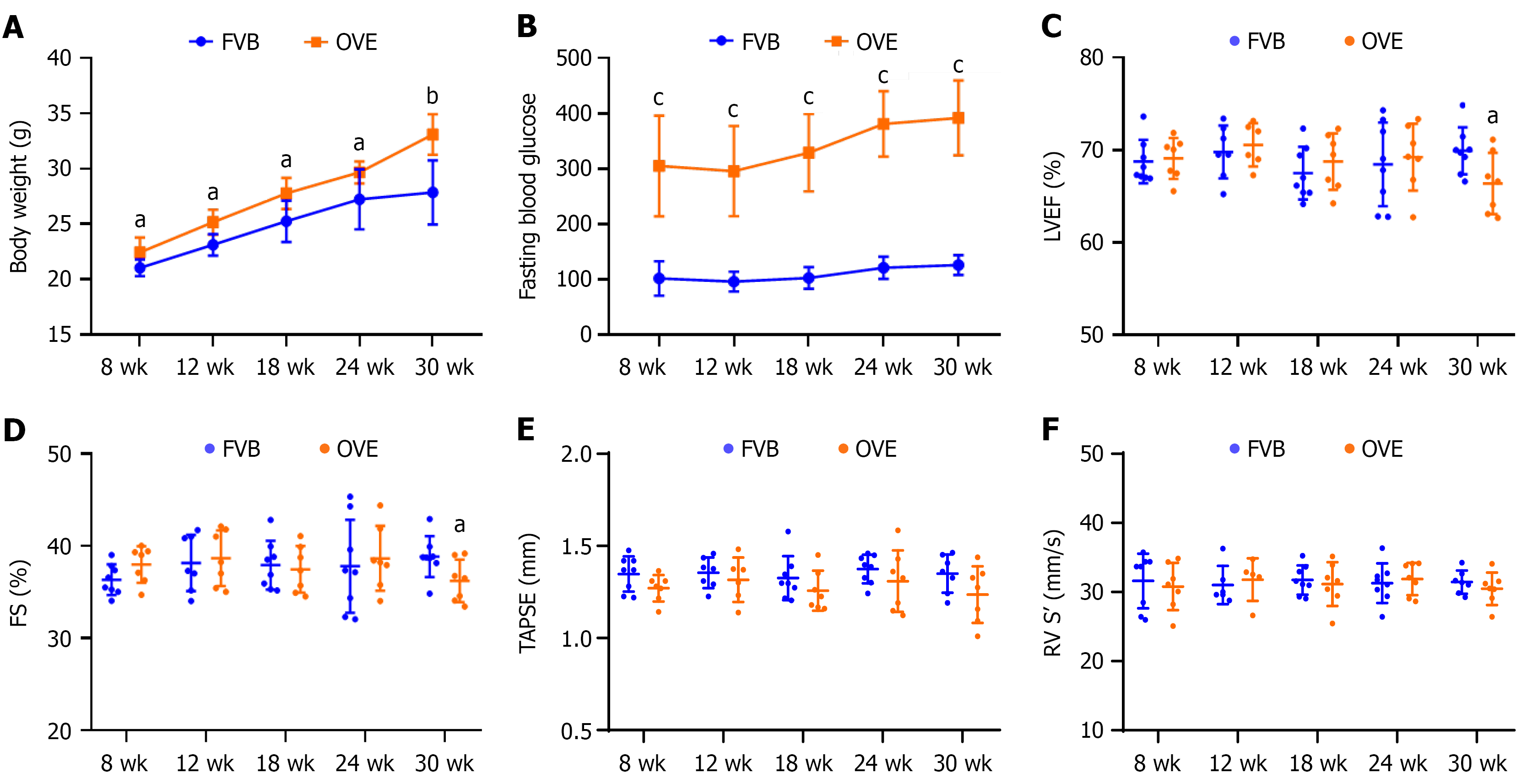 A: Body weight; B: Fasting blood glucose; C: Left ventricle ejection fraction; D: Left ventricle fractional shortening; E: Right ventricle tricuspid valve annular plane systolic excursion; F: Right ventricle systolic velocity. Data are presented as mean ± SD (n = 6-8). aP < 0.05 vs control FVB mice; bP < 0.01 vs control FVB mice; cP = 0.06 vs control FVB mice. LVEF: Left ventricle ejection fraction; FS: Fractional shortening; TAPSE: Tricuspid valve annular plane systolic excursion; RV S’: Right ventricle systolic velocity.