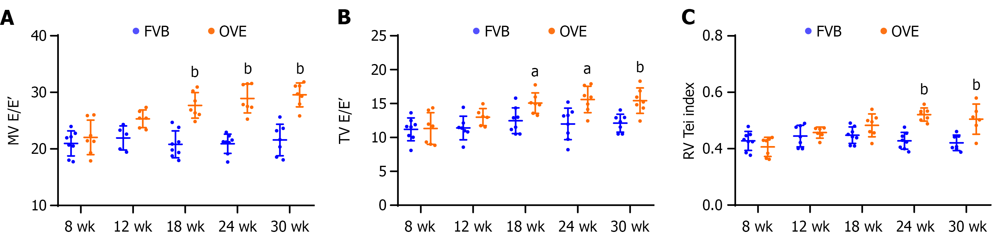 A: Mitral valve E-to-E ratio for left ventricular diastolic dysfunction; B: Tricuspid valve E-to-E ratio for right ventricular diastolic dysfunction; C: Right ventricular myocardial performance index (right ventricular Tei index). Data are presented as mean ± SD (n = 6-8). aP < 0.05 vs control FVB mice; bP < 0.01 vs control FVB mice. MV E/E’: Mitral valve E-to-E ratio; TV E/E’: Tricuspid valve E-to-E ratio; RV: Right ventricular.