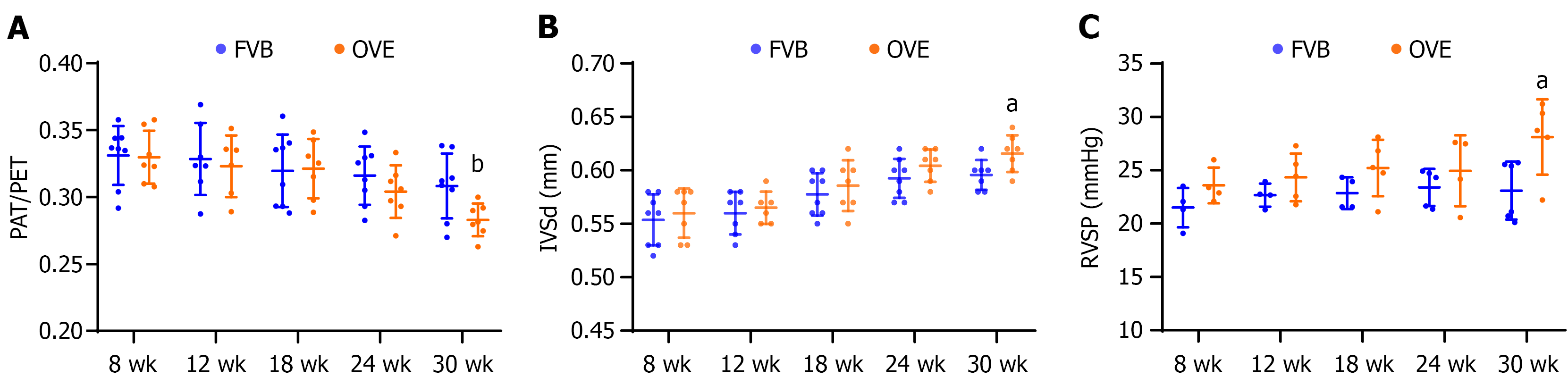A: Pulmonary acceleration time/pulmonary ejection time ratio; B: Diastolic interventricular septum thickness. A and B were measured by echocardiography, data panels A and B are presented as mean ± SD (n = 6-8); C: Right ventricular systolic pressure was measured directly using a right ventricular pressure catheter. Data are presented as mean ± SD (n = 4-6). aP < 0.05 vs control FVB mice; bP = 0.09 vs control FVB mice. PAT: Pulmonary acceleration time; PET: Pulmonary ejection time; IVSd: Interventricular septum thickness; RVSP: Right ventricular systolic pressure.