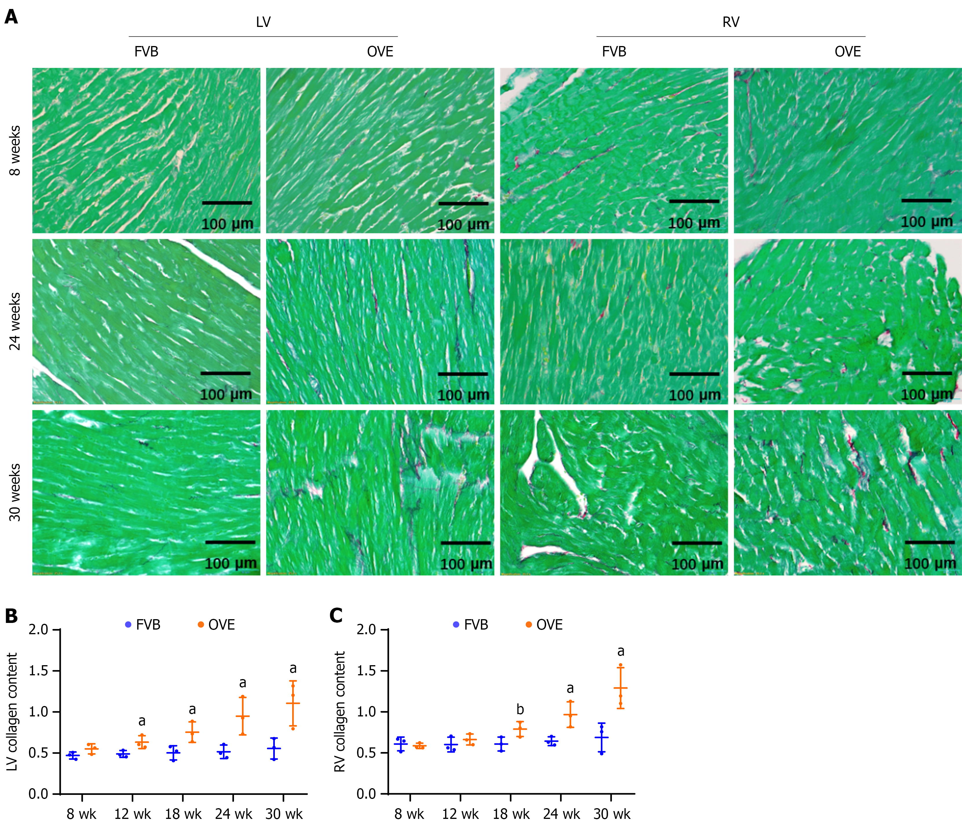 A: Picro-Sirius red staining in left ventricle and right ventricle; B and C: Semi-quantification of cardiac collagen accumulation in left ventricle and right ventricle, respectively. Data are presented as mean ± SD (n = 3). aP < 0.05 vs control FVB mice; bP = 0.05 vs control FVB mice. LV: Left ventricle; RV: Right ventricle.