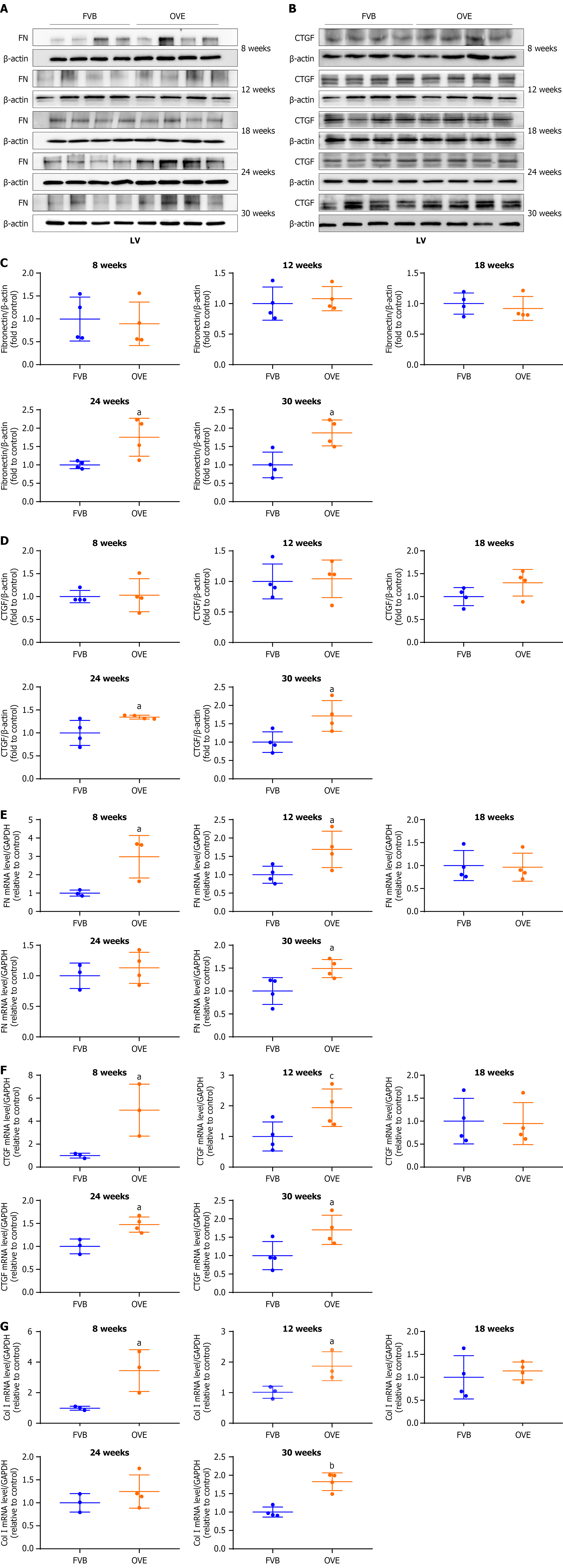 A-D: Changes in fibronectin and connective tissue growth factor protein levels in the left ventricle of 12-week-old mice were assayed by Western blot; E-G: Changes of left ventricle mRNA expression of fibronectin, connective tissue growth factor, and type I collagen were measured by quantitative reverse transcription polymerase chain reaction. Data are presented as mean ± SD (n = 3-4). aP < 0.05 vs control FVB mice; bP < 0.01 vs control FVB mice; cP = 0.06 vs control FVB mice. FN: Fibronectin; CTGF: Connective tissue growth factor; LV: Left ventricle; Col I: Type I collagen.