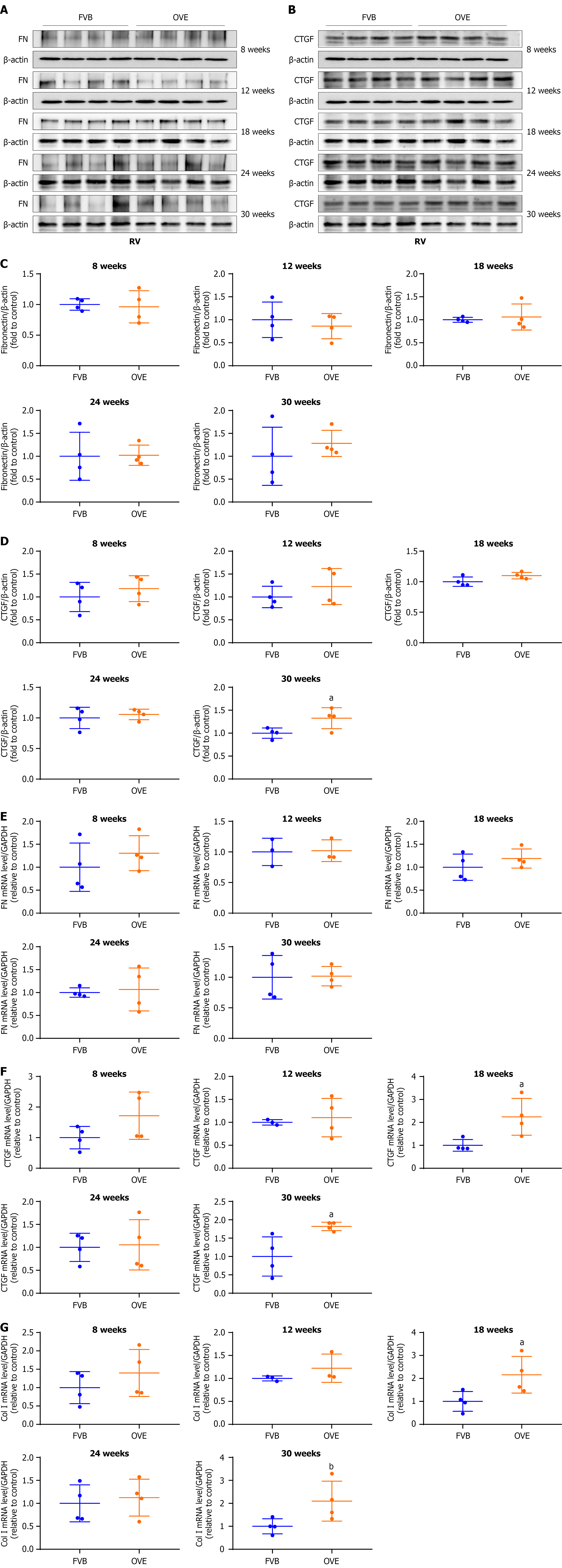 A-D: Changes in fibronectin and connective tissue growth factor protein levels in the right ventricle were assayed by Western blot; E-G: Changes of right ventricle mRNA expression of fibronectin, connective tissue growth factor, type I collagen were measured by quantitative reverse transcription polymerase chain reaction. Data are presented as mean ± SD (n = 3-4). aP < 0.05 vs control FVB mice; bP = 0.06 vs control FVB mice. FN: Fibronectin; CTGF: Connective tissue growth factor; RV: Right ventricle; Col I: Type I collagen.