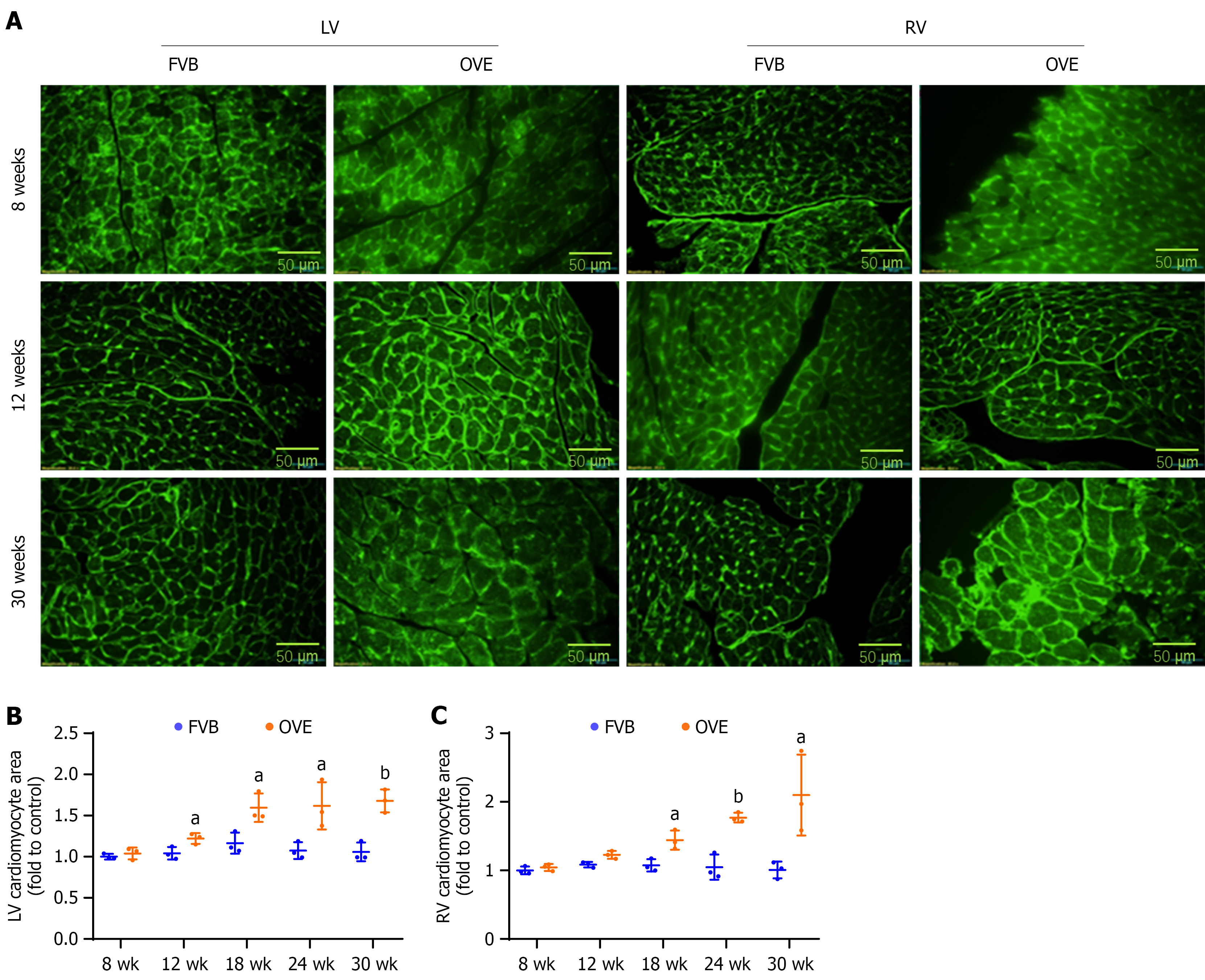 A: Wheat germ agglutinin staining in left ventricle and right ventricle; B: Left ventricle cardiomyocyte cross-sectional area; C: Right ventricle cardiomyocyte cross-sectional area. Data are presented as mean ± SD (n = 3). aP < 0.05 vs control FVB mice; bP < 0.01 vs control FVB mice. LV: Left ventricle; RV: Right ventricle.