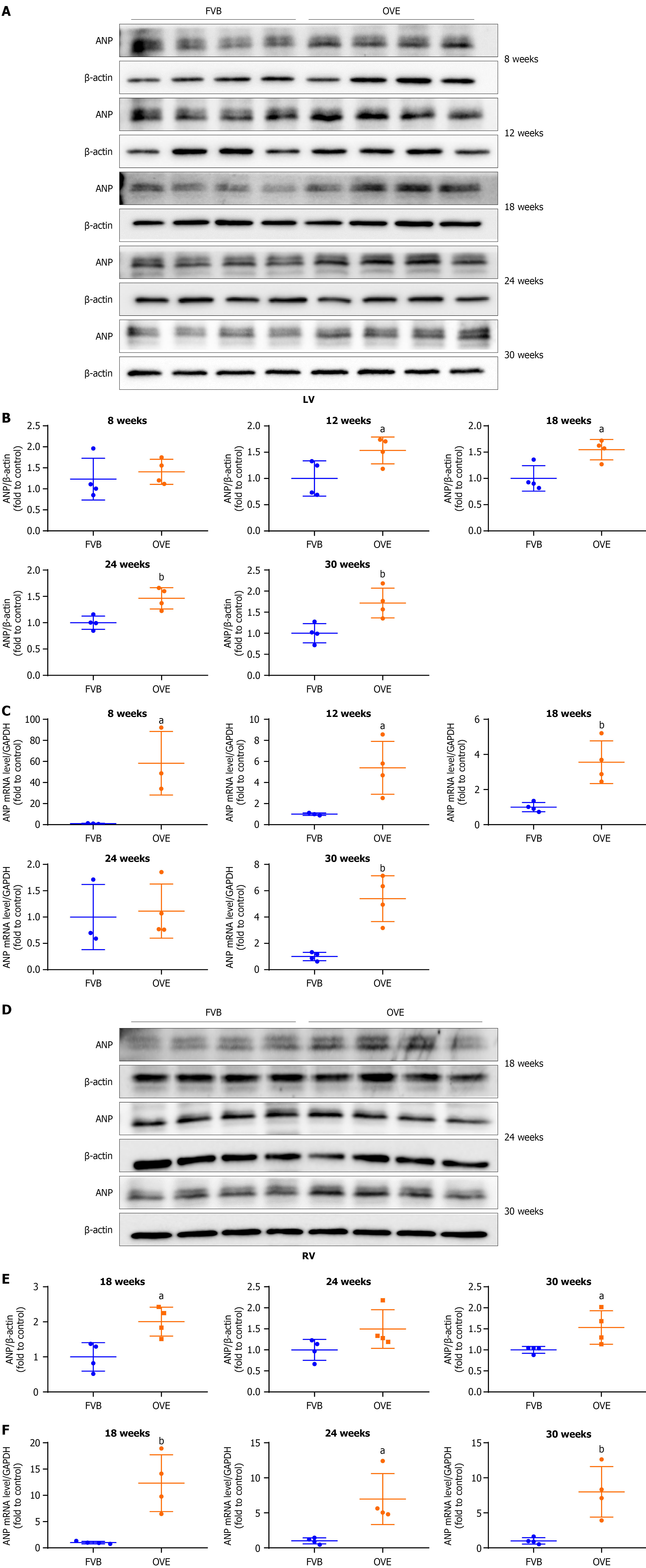 A and B: Changes in atrial natriuretic peptide protein levels in the left ventricle were assayed by Western blot; C: Changes in atrial natriuretic peptide mRNA expression in the left ventricle were measured by quantitative reverse transcription polymerase chain reaction; D and E: Changes in atrial natriuretic peptide protein levels in the right ventricle were assayed by Western blot; F: Changes in atrial natriuretic peptide mRNA expression in the right ventricle were measured by quantitative reverse transcription polymerase chain reaction. Data are presented as mean ± SD (n = 4). aP < 0.05 vs control FVB mice; bP < 0.01 vs control FVB mice. LV: Left ventricle; ANP: Atrial natriuretic peptide; RV: Right ventricle.