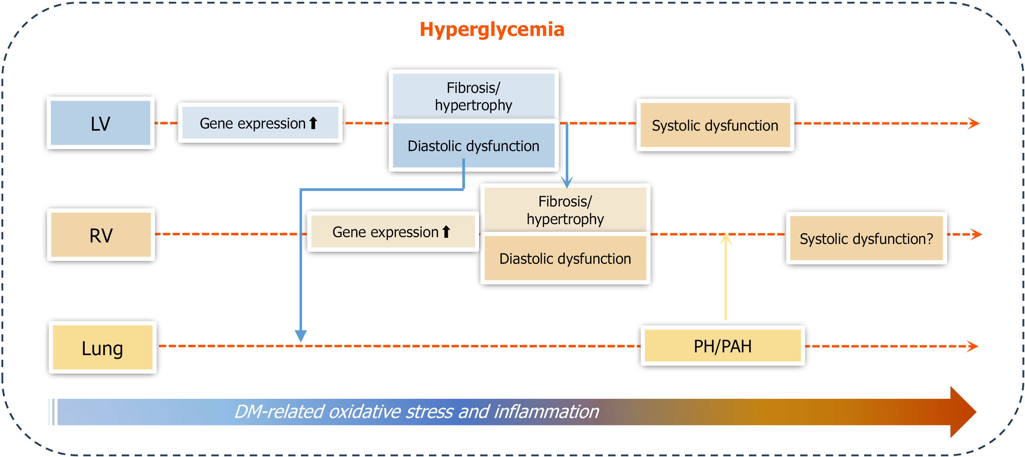 Under hyperglycemic conditions that promote progressive cardiac oxidative stress and inflammation, right ventricular (RV) systolic function remained comparable to controls, whereas left ventricular (LV) systolic function declined in type 1 diabetes (T1D) mice by 30 weeks of age. RV diastolic dysfunction became evident by 18 weeks and worsened by 30 weeks, while LV diastolic dysfunction showed an increasing trend at 12 weeks, reached significance by 18 weeks, and further progressed by 30 weeks. Additionally, RV diastolic dysfunction was accompanied by RV cardiac fibrosis and hypertrophy, which occurred later than the corresponding changes in the LV. Pulmonary arterial hypertension (PAH) developed in T1D mice, evidenced by increased pulmonary acceleration time to pulmonary ejection time ratio and RV peak systolic pressure at 30 weeks. In conclusion, T1D can cause diabetic cardiomyopathy, including both RV and LV dysfunctions, which are mediated by pathological remodeling (hypertrophy and fibrosis) of each ventricle; however, diastolic dysfunction occurs earlier than systolic dysfunction. Mild PAH is present at later stages of T1D, most likely derived from LV dysfunction. The development of PAH may contribute to RV systolic impairment and remodeling. DM: Diabetes mellitus; LV: Left ventricle; RV: Right ventricle; PH: Pulmonary hypertension; PAH: Pulmonary arterial hypertension.