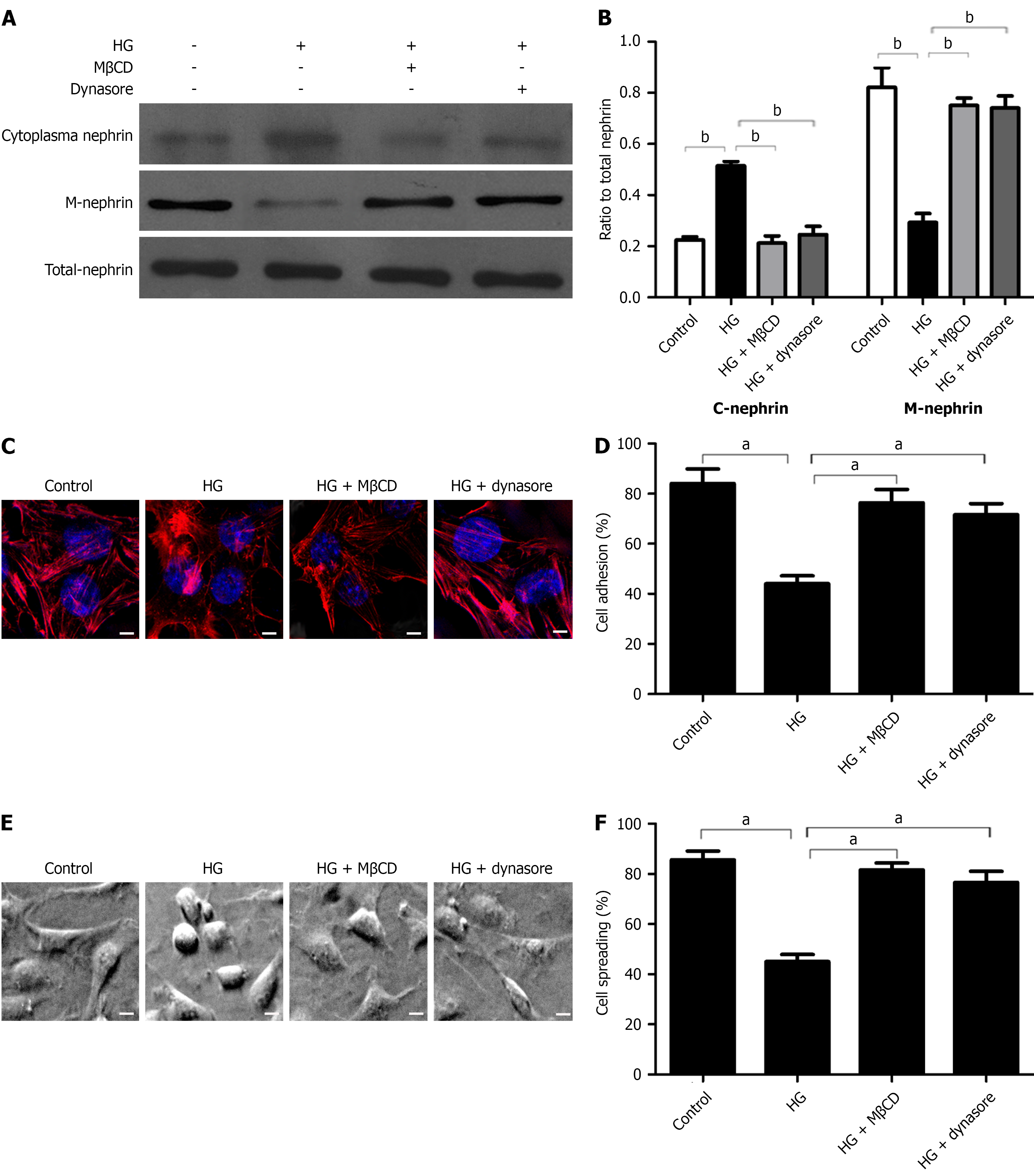 A and B: Western blot analysis of cytoplasmic nephrin, membrane nephrin, and total nephrin in podocytes after different treatments and densitometric quantification of these results (n = 3); C: Representative confocal microscopy images of podocytes after different treatments (magnification: × 1000; scale bar: 50 μm; blue: Nuclei; red: Cytoskeleton); D: Adhesion of podocytes after different treatments (n = 3); E and F: Representative electron microscopy images of podocyte spreading after different treatments (magnification: × 400; scale bar: 20 μm) and quantification of these results (n = 3). aP < 0.05; bP < 0.001. HG: High-dose glucose.