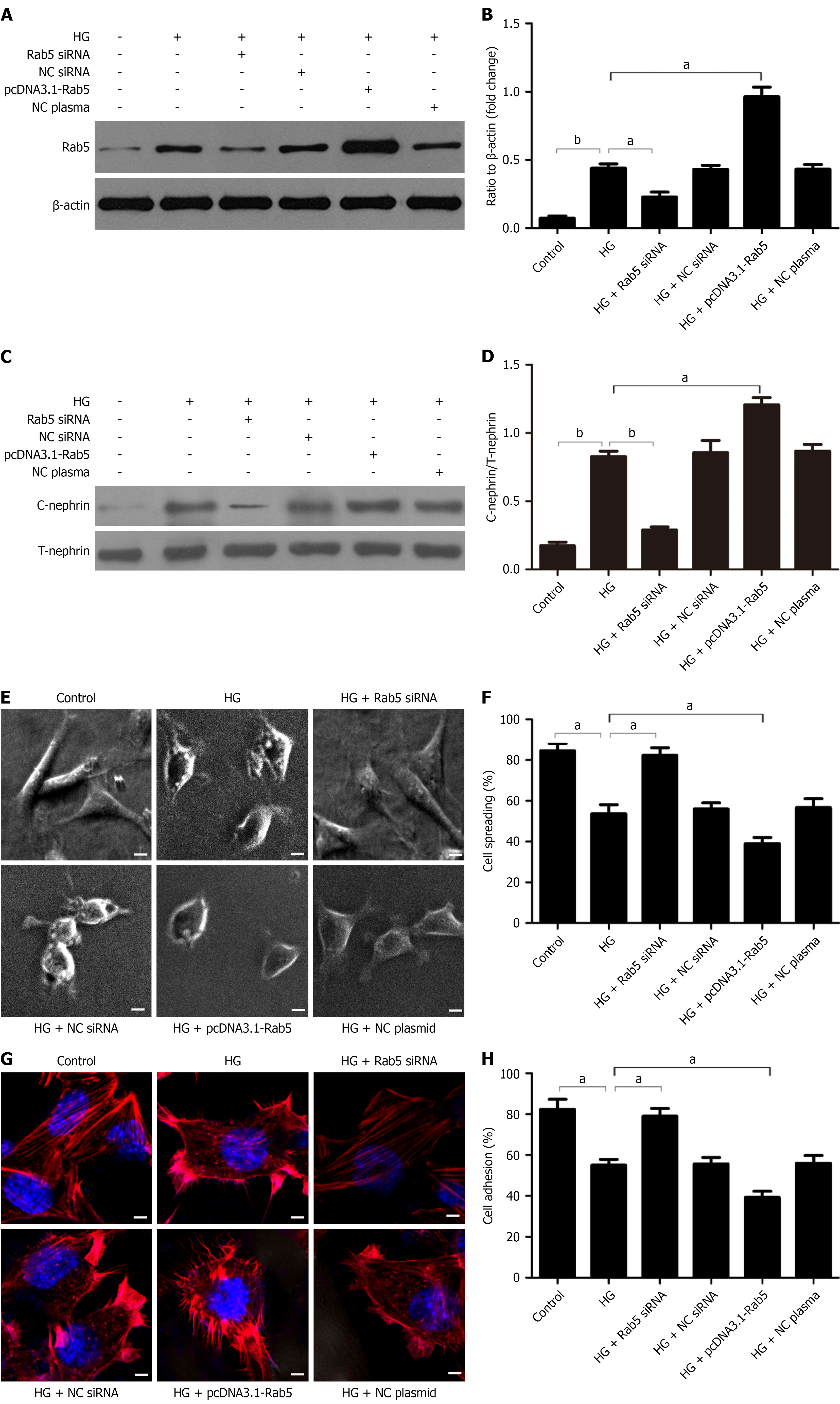 A and B: Western blot analysis of Rab5 in podocytes after different treatments and densitometric quantification of these results (n = 3); C and D: Western blot analysis of cytoplasmic nephrin (C-nephrin) and total nephrin (T-nephrin) in podocytes after different treatments and densitometric quantification of the C-nephrin/T-nephrin ratio (n = 3); E and F: Representative electron microscopy images of podocyte spreading after different treatments (magnification: × 1000; scale bar: 50 μm) and quantification of these results (n = 3); G: Representative confocal microscopy images of podocytes after different treatments (magnification: × 1000; scale bar: 50 μm; blue nuclei; red: Cytoskeleton); H: Adhesion of podocytes after different treatments (n = 3). aP < 0.05; bP < 0.001. HG: High-dose glucose; NC: Negative control.