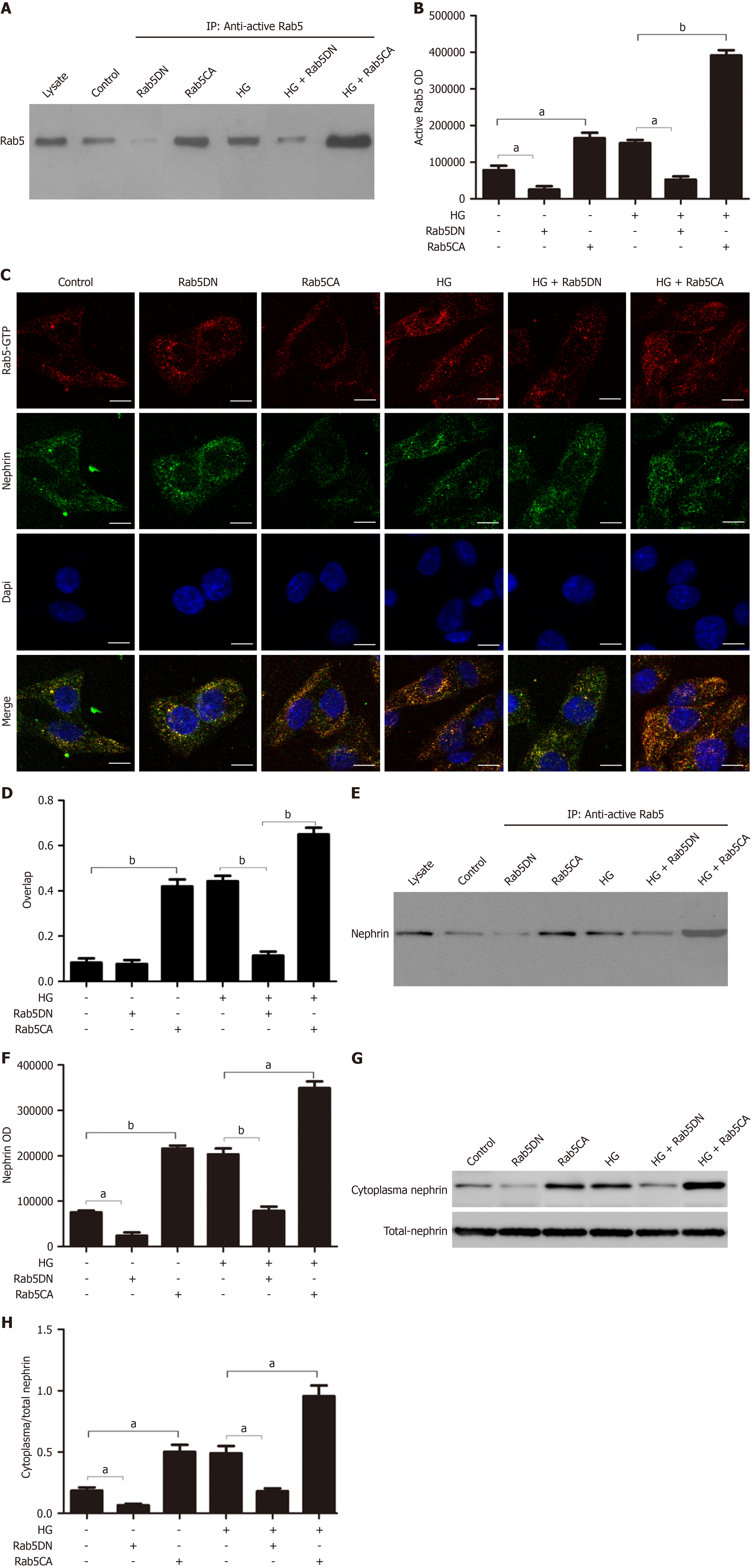 A and B: Co-immunoprecipitation of active Rab5 (Rab5-GTP) in podocytes after different treatments and quantification of these results (n = 3); C and D: Representative co-localization images and quantitative of nephrin (green) and active Rab5 (red) in podocytes after different treatments (magnification: × 630; Scale bar: 20 μm); E and F: Co-immunoprecipitation of nephrin and active Rab5 in podocytes after different treatments and quantification of these results (n = 3); G and H: Western blot analysis of cytoplasmic nephrin and total nephrin in podocytes after different treatments and quantification of the C-nephrin/T-nephrin ratio (n = 3). aP < 0.05; bP < 0.001. HG: High-dose glucose.