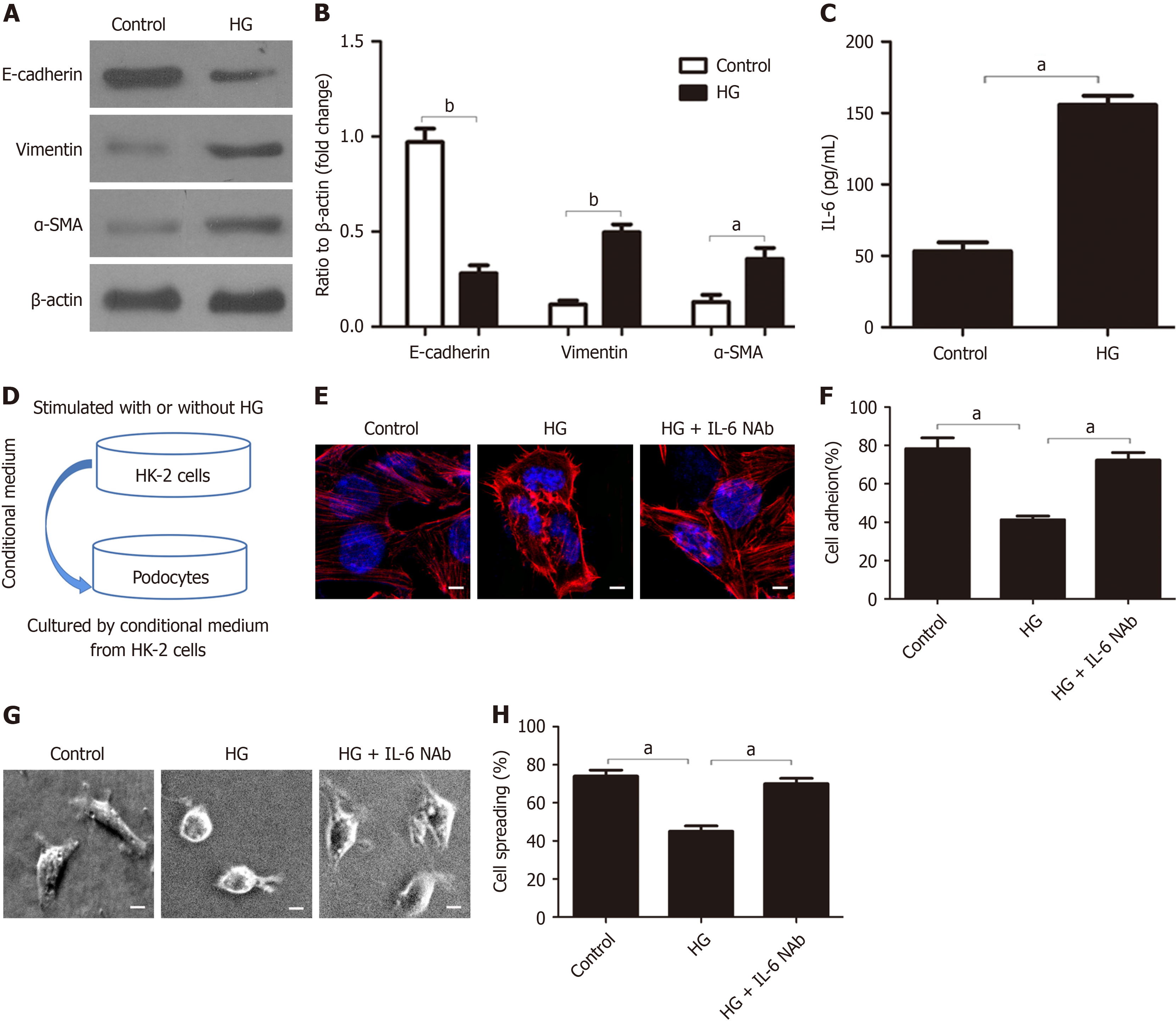 A and B: Western blot analysis of E-cadherin, vimentin, and α-SMA in HK-2 cells after different treatments and quantification of these results (n = 3); C: ELISA measurements of IL-6 after different treatments (n = 3); D: Method used to examine the effect of HK-2 conditioned medium on podocytes; E: Representative confocal microscopy images of podocytes after culture in different conditioned media (magnification: × 1000; scale bar: 50 μm; blue: Nuclei: Red: Cytoskeleton); F: Quantitative analysis of podocyte adhesion after culture in different conditioned media (n = 3); G and H: Representative electron microscopy images of podocyte spreading after culture in different conditioned media (magnification: × 400; scale bar: 20 μm) and quantification of these results (n = 3). aP < 0.05; bP < 0.001. HG: High-dose glucose; NAb: Neutralizing Ab.