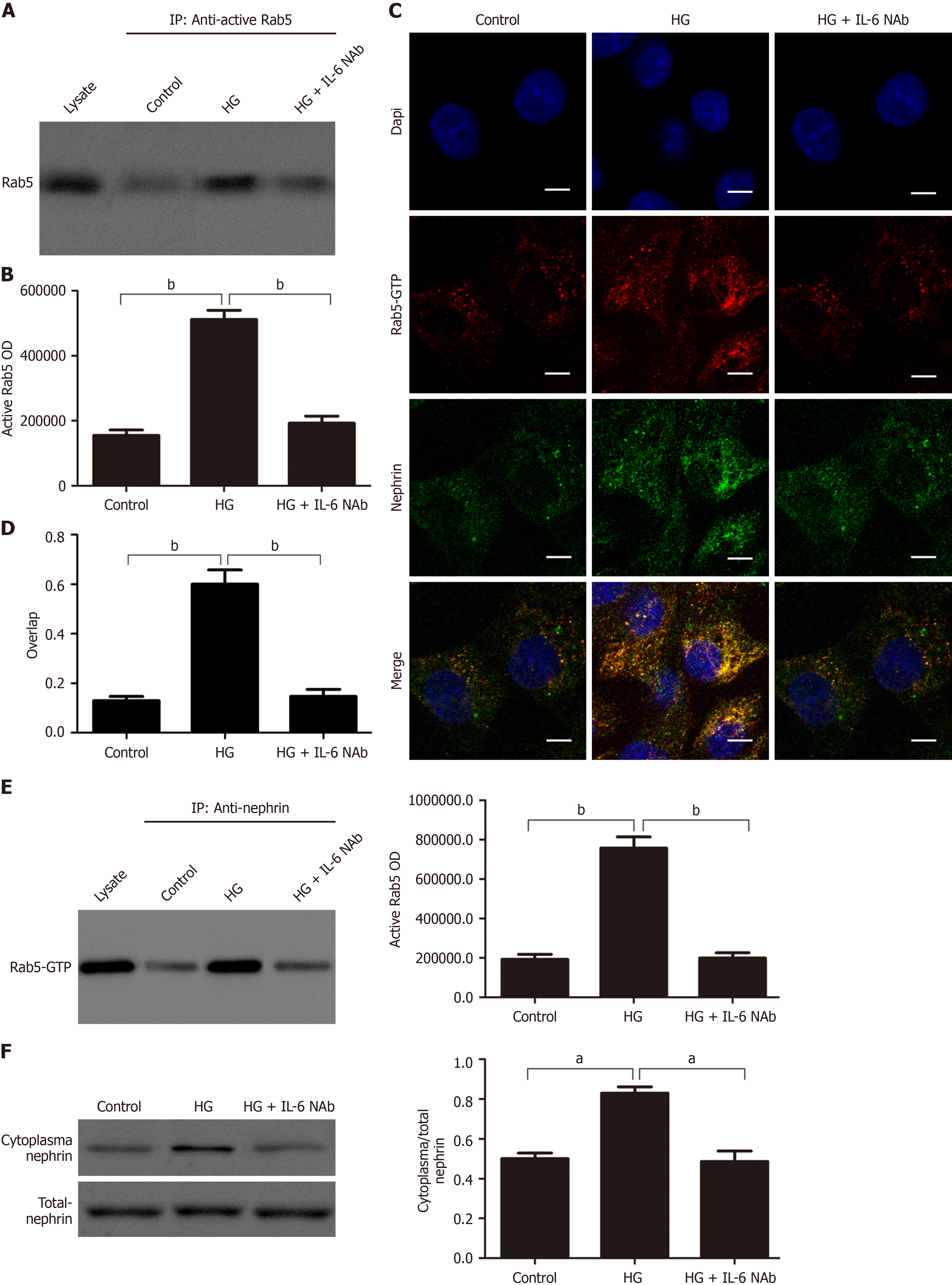 A and B: Co-immunoprecipitation of active Rab5 (Rab5-GTP) in podocytes cultured in different conditioned media and quantification of these results (n = 3); C and D: Representative co-localization images and quantitative of nephrin (green) and active Rab5 (red) in podocytes grown in different conditioned media (magnification: × 630; scale bar: 20 μm); E: Co-immunoprecipitation of nephrin and active Rab5 in podocytes grown in different conditioned media and quantification of these results (n = 3; F: Western blot analysis of cytoplasmic nephrin (C-nephrin) and total nephrin (T-nephrin) after growth in different conditioned media and quantification of the C-nephrin/T-nephrin ratio (n = 3). aP < 0.05; bP < 0.001. HG: High-dose glucose; NAb: Neutralizing Ab.